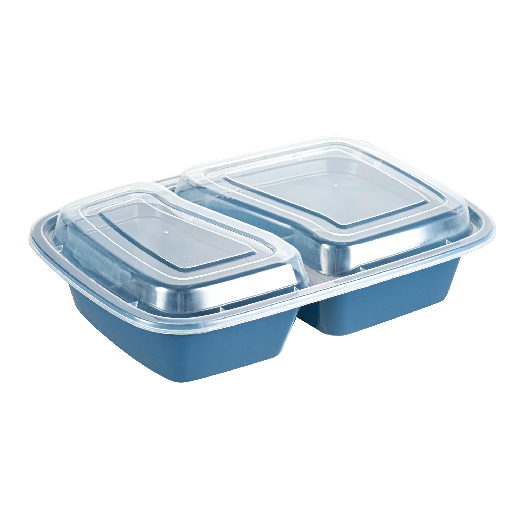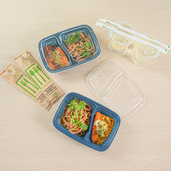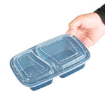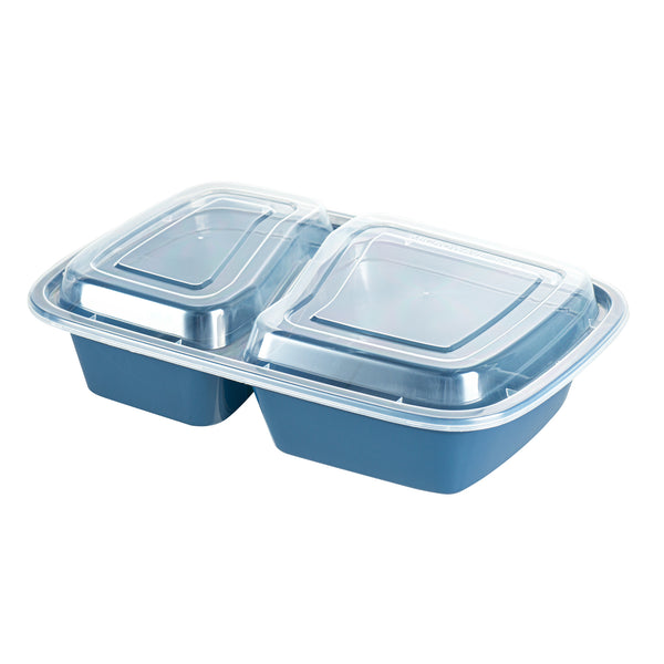 Enhance your foodservice offerings with our Asporto 32-ounce Midnight Blue Plastic 2 Compartment Food Containers. These meal prep containers feature 2 compartments with 12.5 and 8 ounce capacities, efficiently separating entrees from snacks or sides. To minimize the risk of spills in transit, the clear plastic lids of these takeaway boxes create a tight-fitting seal to keep your food intact. These to go boxes are microwave-safe and allow customers to heat meals conveniently. Manufactured from BPA-free plastic, these take out containers are durable and ideal for packing various hot and cold food items. The midnight blue finish of these carry out containers enhances the look of take out and delivery food orders. These to go containers are disposable and can discarded after use for an easy cleaning experience. To showcase your eco-friendly practices to your patrons, these takeaway containers are recyclable. Measuring 8.75 inches in length by 6 inches in width by 2 inches in height, these plastic food containers have a total capacity of 32 ounces. Sold in a 100 count box.
