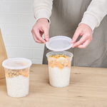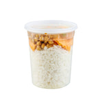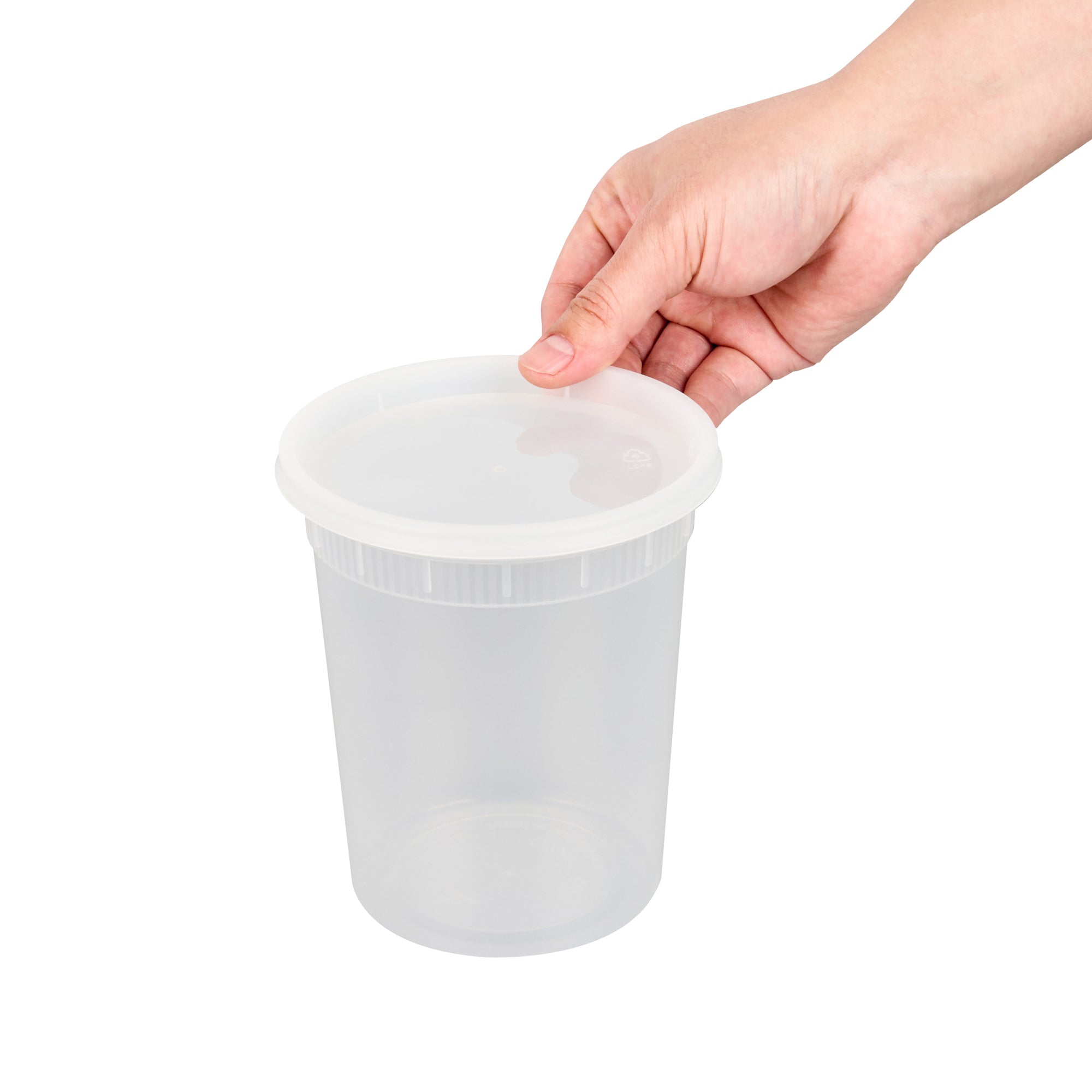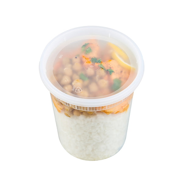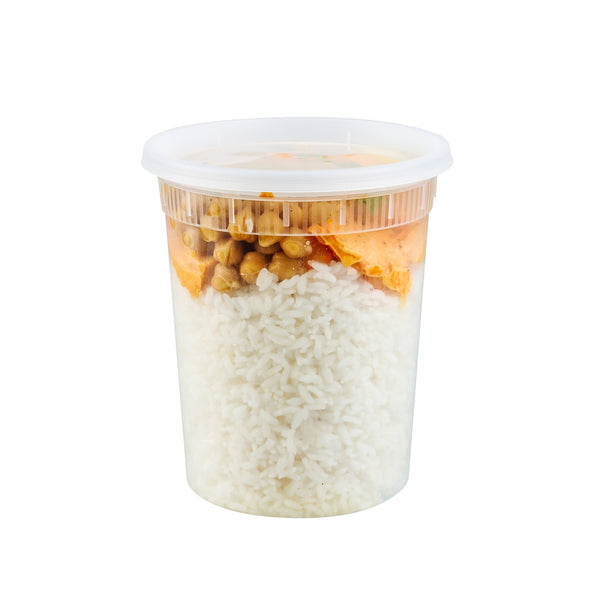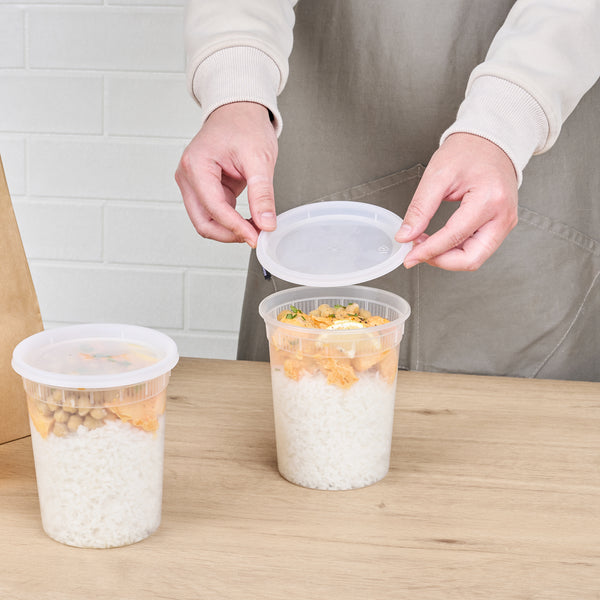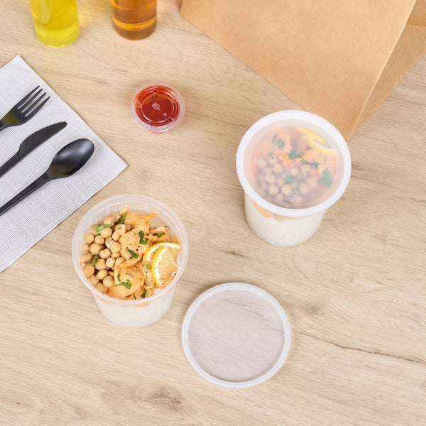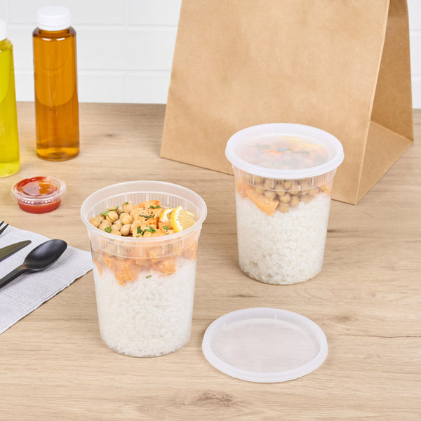 Seamlessly pack sizable portions of soups or snacks for take out services with our Asporto 32-ounce Round Clear Plastic Soup Containers. These clear containers for take outs are crafted from BPA-free and heat-resistant plastic, making them great for delivering hot meals. Each disposable to go boxes features a clear plastic lid that forms a secure seal to prevent spills during transit. These transparent soup containers are microwave-safe, eliminating the need to transfer food when reheating. With an impressive 32-ounce capacity, these round food containers are great for large servings. These takeaway containers are recyclable, providing customers with an eco-friendlier way to discard them after use. With a clear finish, these disposable food containers allow your patrons to visually assess their contents without the need to unseal them. Each carry out container measures 4.5 inches in diameter by 5.5 inches in height and have a capacity of 32 ounces. Sold in a 25 count box. NOTE: Lids are not for microwave use.