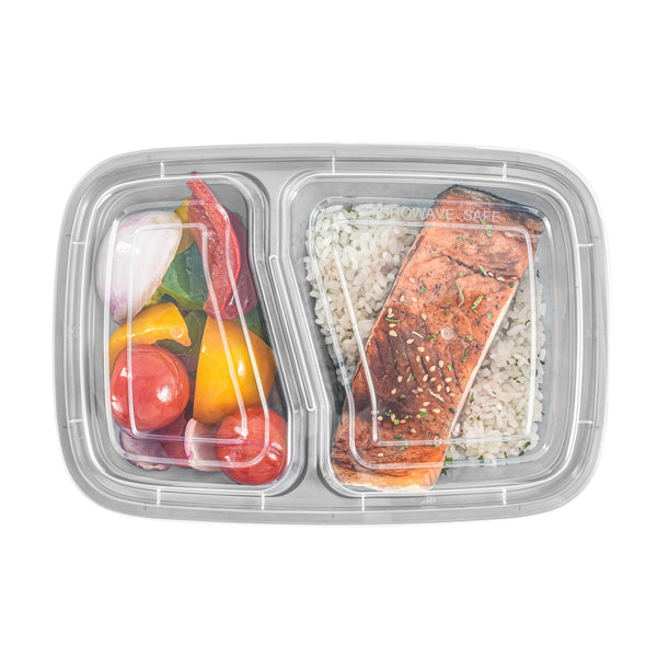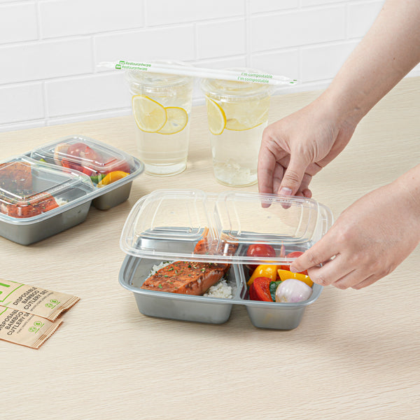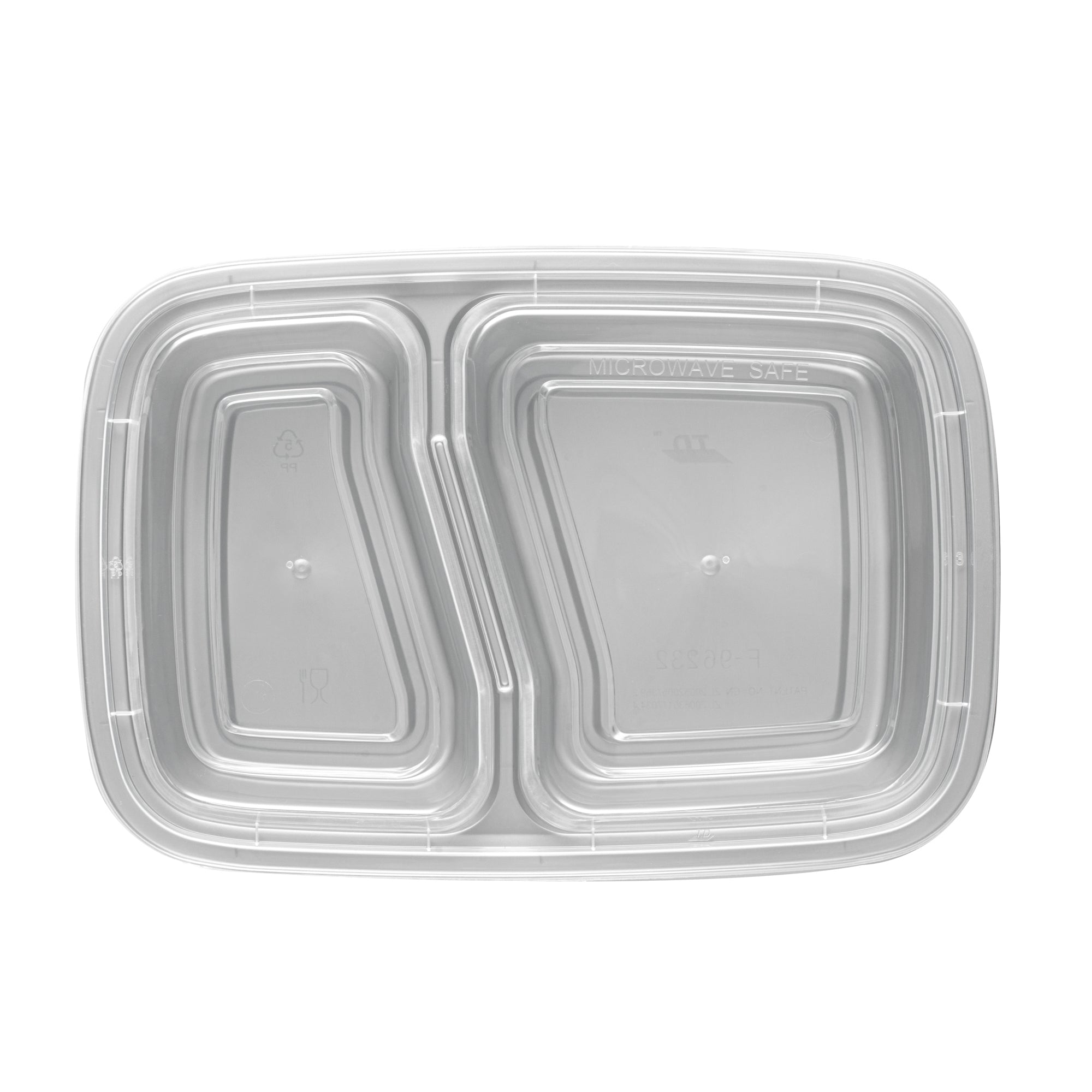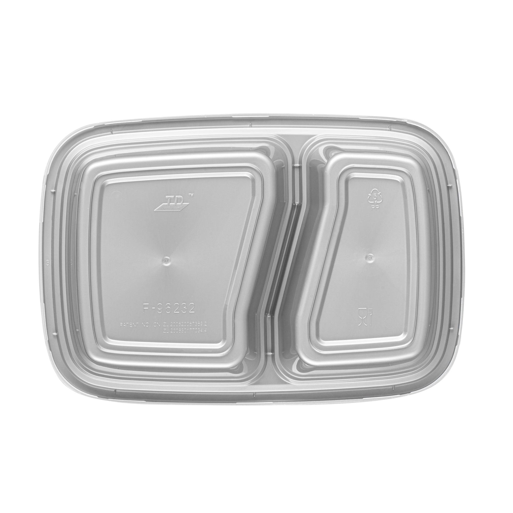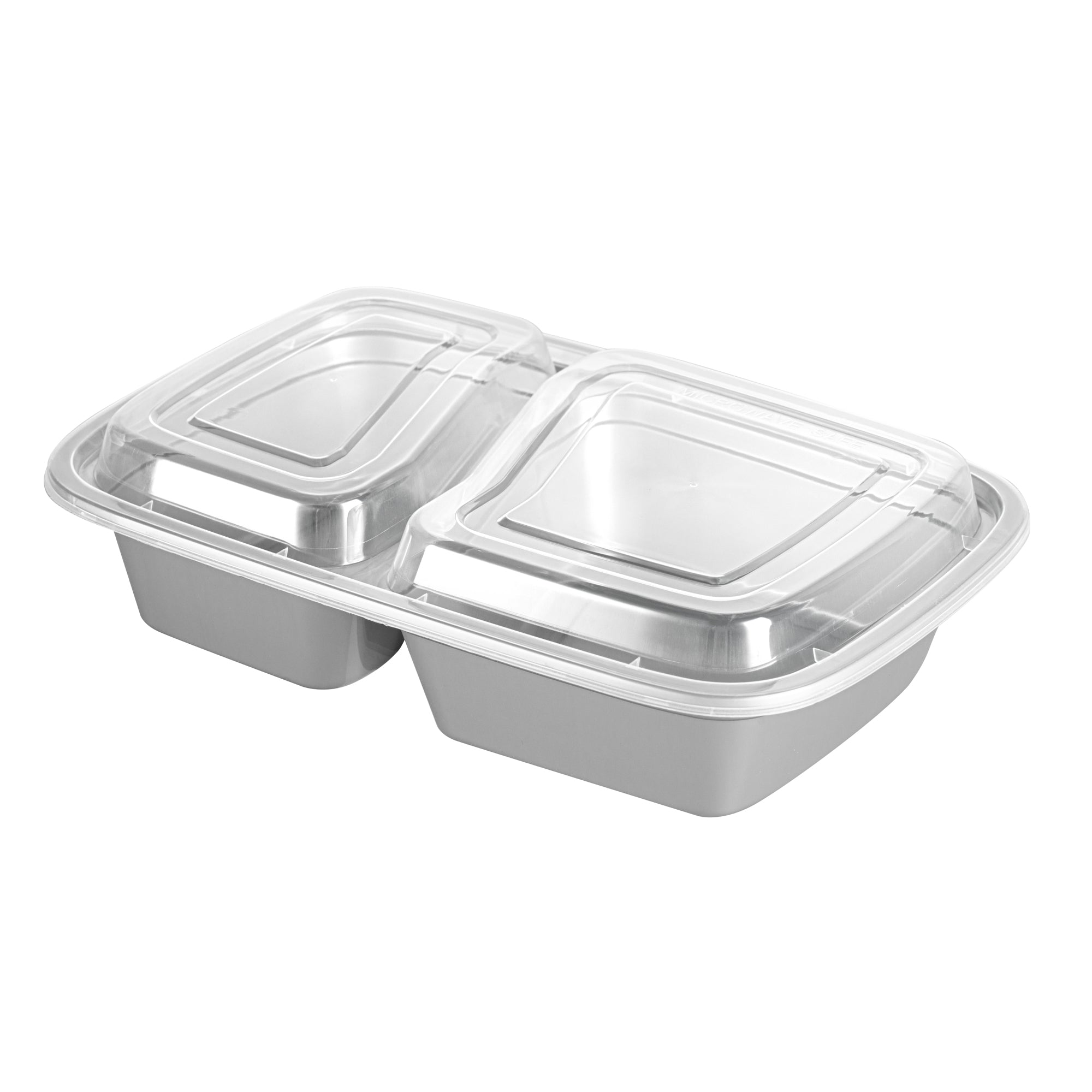 Pack your culinary creations with our Asporto 32-ounce Silver Plastic 2 Compartment Food Containers. These meal prep containers have 2 compartments that have a capacity of 12.5 and 8 ounces and efficiently separate entrees from snacks or sides. The clear plastic lids of these carry out containers snap on tightly, minimizing the risk of spills and avoiding messes. These takeaway boxes are microwave-safe and allow you to reheat meals without transferring them to different containers. Made from BPA-free plastic, these take out containers are durable, making them perfect for packing various hot and cold food items. The sleek silver finish of these to go boxes enhances the presentation of your take out and delivery food orders. These to go containers are disposable and facilitate an easy cleaning experience. Ideal for eco-friendly foodservice establishments, these food containers are recyclable. Measuring 8.75 inches in length by 6 inches in width by 2 inches in height, these disposable take out containers have a total capacity of 32 ounces. Sold in a 100 count box.
