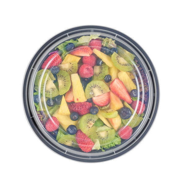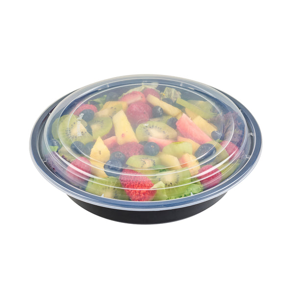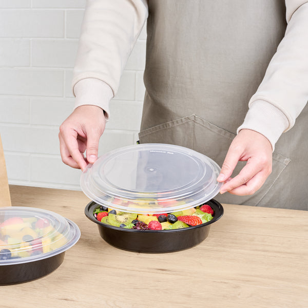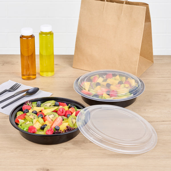 Pack food with style using our Asporto 48-ounce Round Black Plastic To Go Boxes. These disposable carry out containers are made from BPA-free, heat-resistant polypropylene plastic, making them perfect for packing various types of food items. With a secure sealing clear plastic lid, these food take out containers completely eliminates the risk of spills during transit. These microwave-safe plastic to go boxes simplify clients' reheating process by eliminating the need for other utensils. With a capacity to hold up to 48 ounces, these black take out boxes are the ultimate solution for large meals. Being both recyclable and disposable, these round food containers are an eco-friendly choice that enables easy cleanup. The polished black finish on these takeaway containers lends a striking appeal to your takeaway orders. Each take out box measures 9 inches in diameter by 1.75 inches in height and have a capacity of 48 ounces. Sold in a 100 count box.