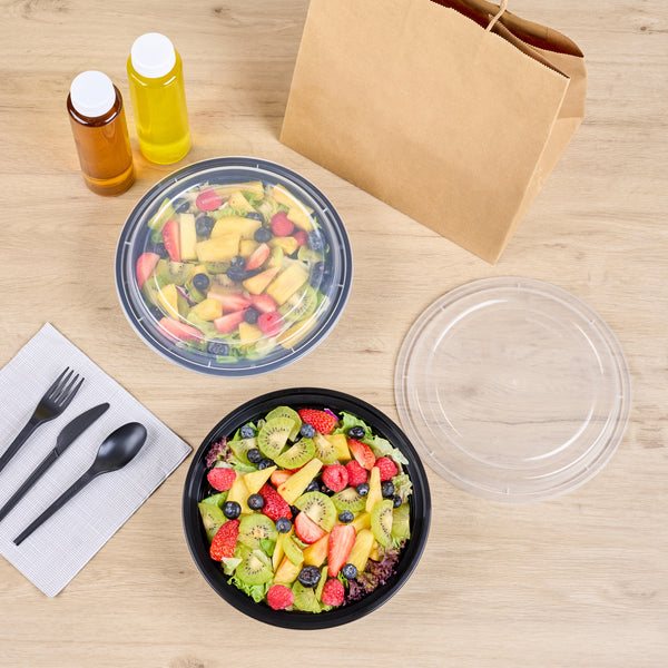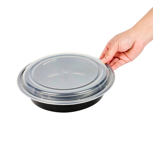 Pack food with style using our Asporto 48-ounce Round Black Plastic To Go Boxes. These disposable carry out containers are made from BPA-free, heat-resistant polypropylene plastic, making them perfect for packing various types of food items. With a secure sealing clear plastic lid, these food take out containers completely eliminates the risk of spills during transit. These microwave-safe plastic to go boxes simplify clients' reheating process by eliminating the need for other utensils. With a capacity to hold up to 48 ounces, these black take out boxes are the ultimate solution for large meals. Being both recyclable and disposable, these round food containers are an eco-friendly choice that enables easy cleanup. The polished black finish on these takeaway containers lends a striking appeal to your takeaway orders. Each take out box measures 9 inches in diameter by 1.75 inches in height and have a capacity of 48 ounces. Sold in a 50 count box. NOTE: Lids are not for microwave use.