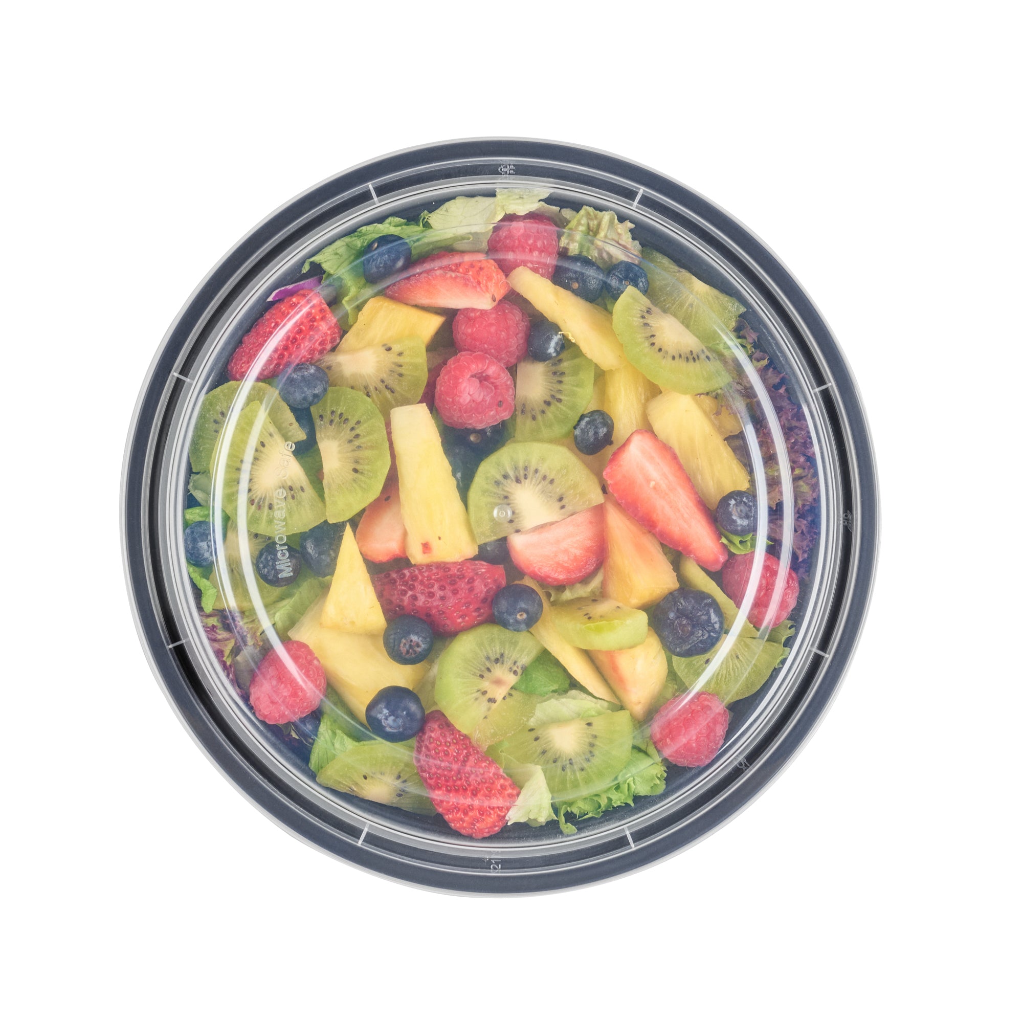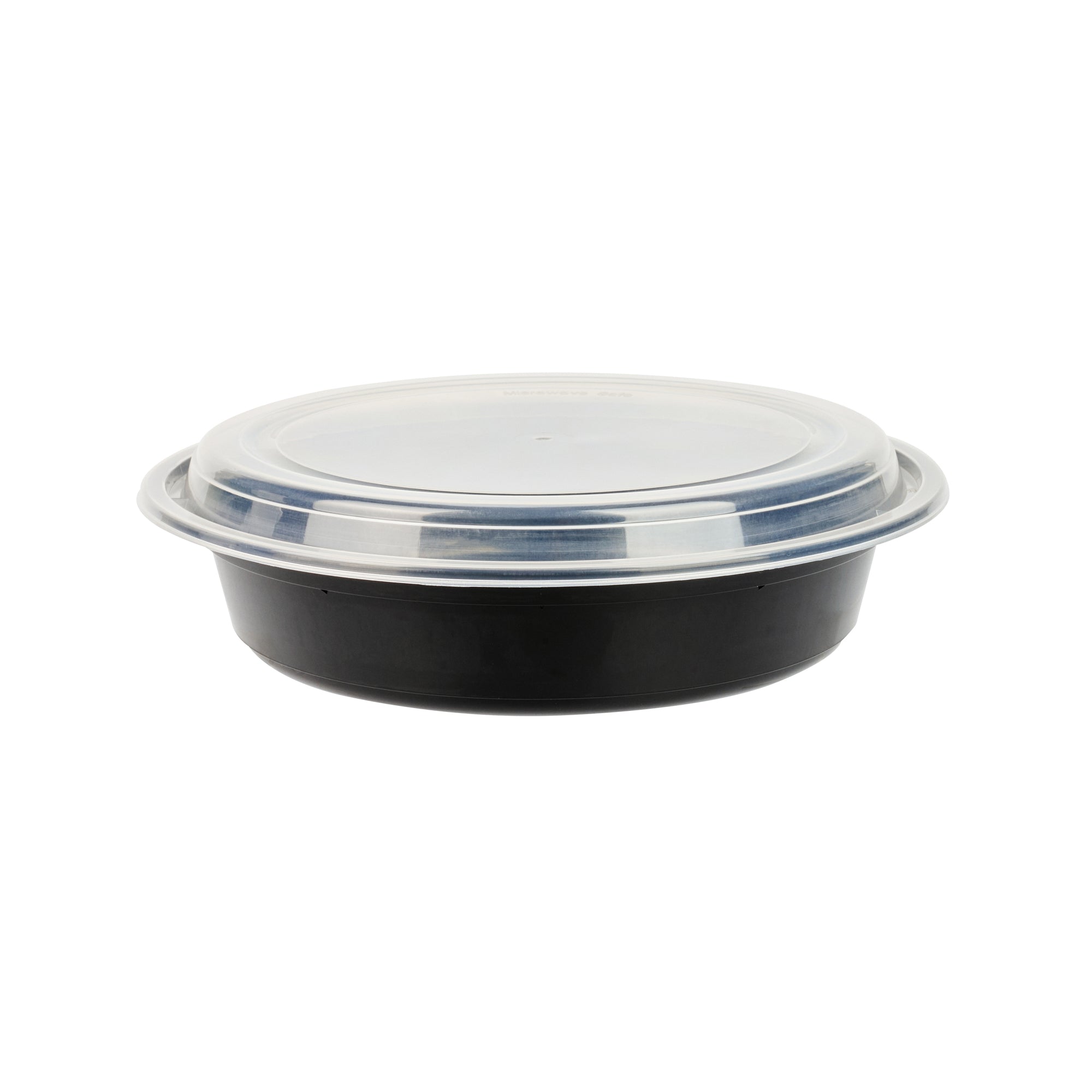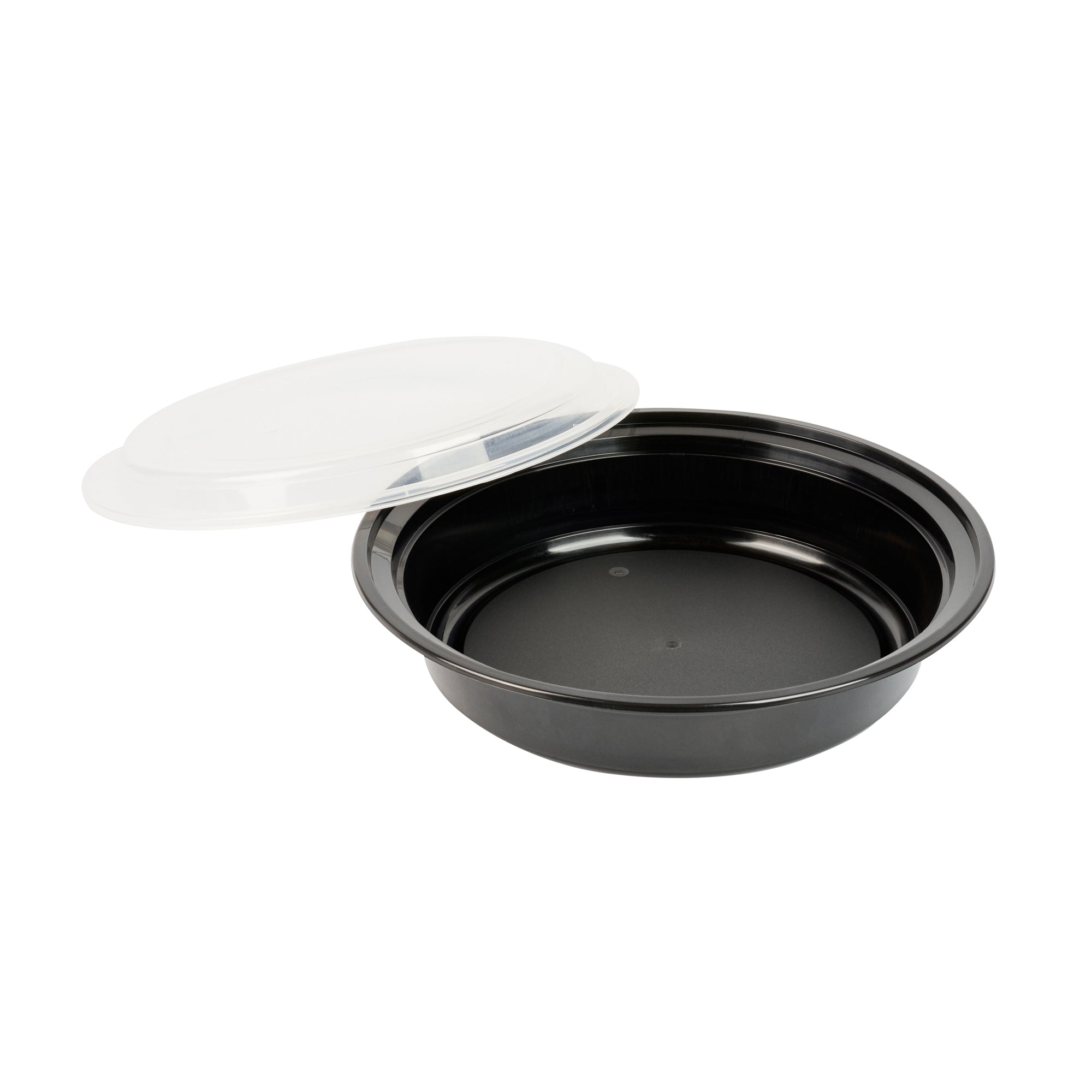 Pack food with style using our Asporto 48-ounce Round Black Plastic To Go Boxes. These disposable carry out containers are made from BPA-free, heat-resistant polypropylene plastic, making them perfect for packing various types of food items. With a secure sealing clear plastic lid, these food take out containers completely eliminates the risk of spills during transit. These microwave-safe plastic to go boxes simplify clients' reheating process by eliminating the need for other utensils. With a capacity to hold up to 48 ounces, these black take out boxes are the ultimate solution for large meals. Being both recyclable and disposable, these round food containers are an eco-friendly choice that enables easy cleanup. The polished black finish on these takeaway containers lends a striking appeal to your takeaway orders. Each take out box measures 9 inches in diameter by 1.75 inches in height and have a capacity of 48 ounces. Sold in a 50 count box. NOTE: Lids are not for microwave use.