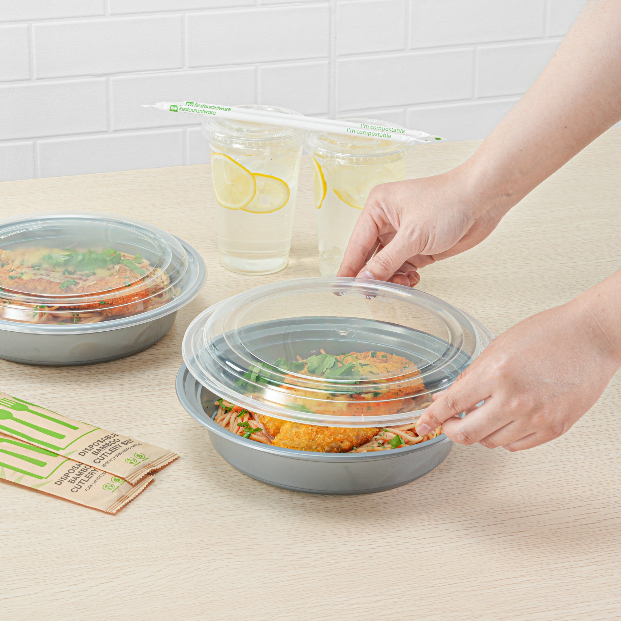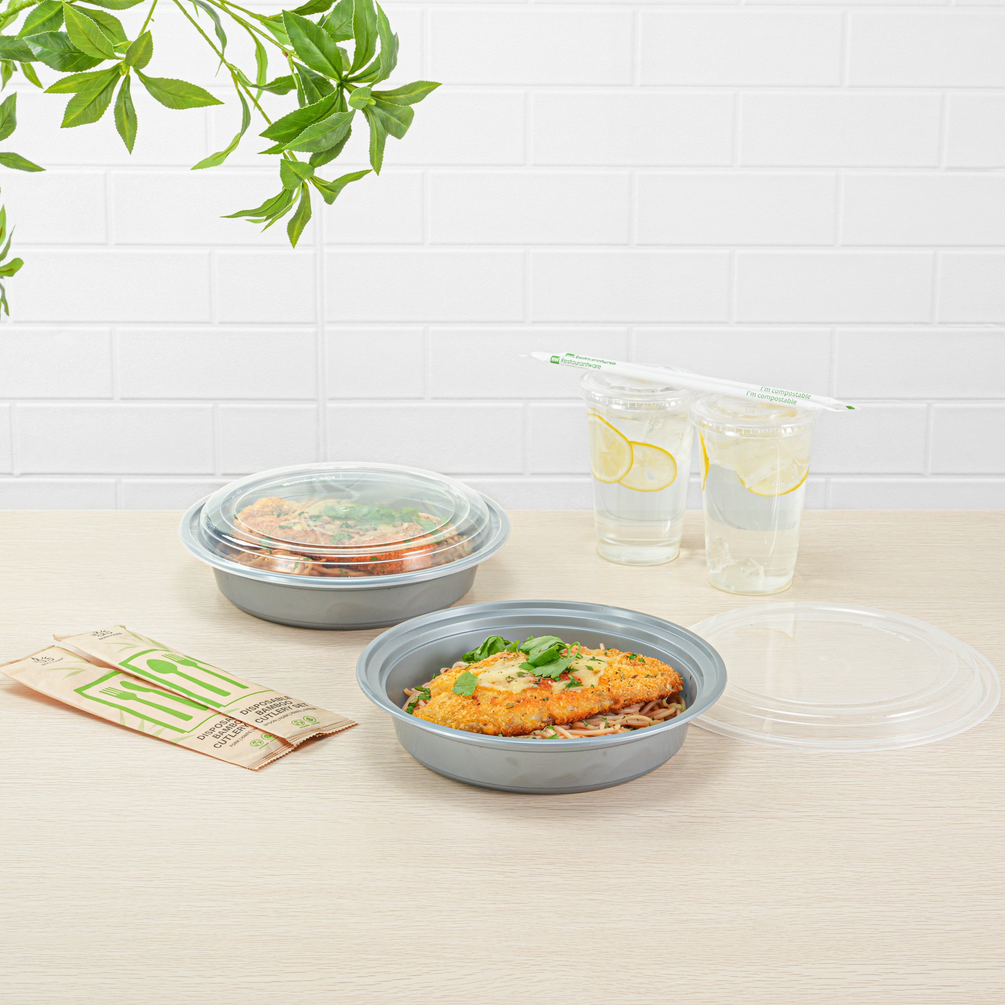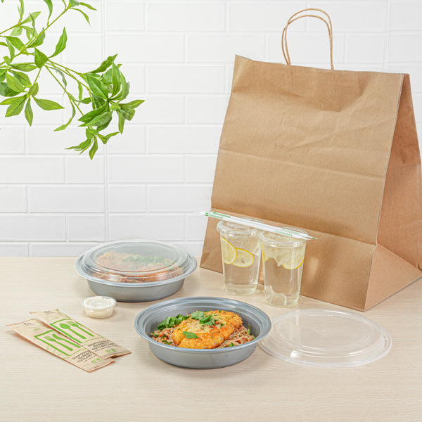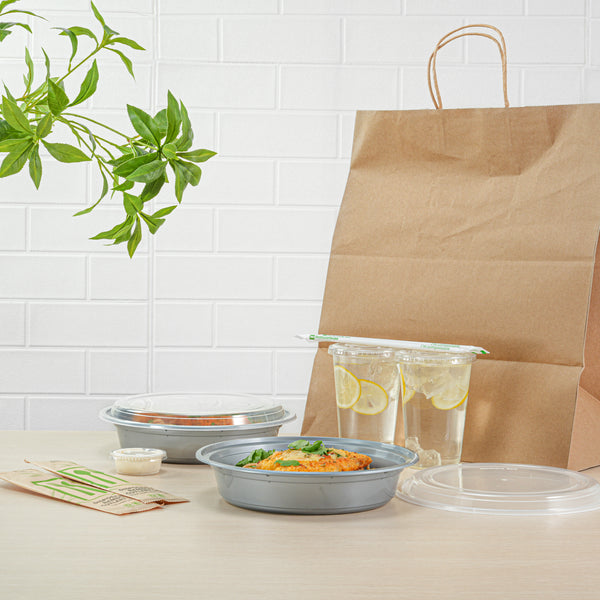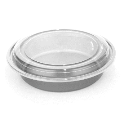 Pack your signature dishes with our Asporto 48-ounce Round Silver Plastic To Go Boxes. These carry out containers come with clear plastic lids and form a tight-fitting seal to prevent spills in transit. To enjoy hot meals easily, these meal prep containers are microwave-safe and allow you to reheat meals without transferring them to a different container. Crafted from BPA-free plastic, these takeaway boxes are durable and suitable for packing various hot and cold food items. These to go boxes have a sleek silver finish and elevate the look of your food presentation. For an easy post-meal cleaning experience, these take out containers are disposable and can be discarded after use. These to go containers are recyclable and ideal for eco-conscious foodservice establishments. Measuring 9 inches in diameter by 1.75 inches in height, these disposable food containers have a capacity of 48 ounces and offer ample space for your culinary creations. Sold in a 100 count box.