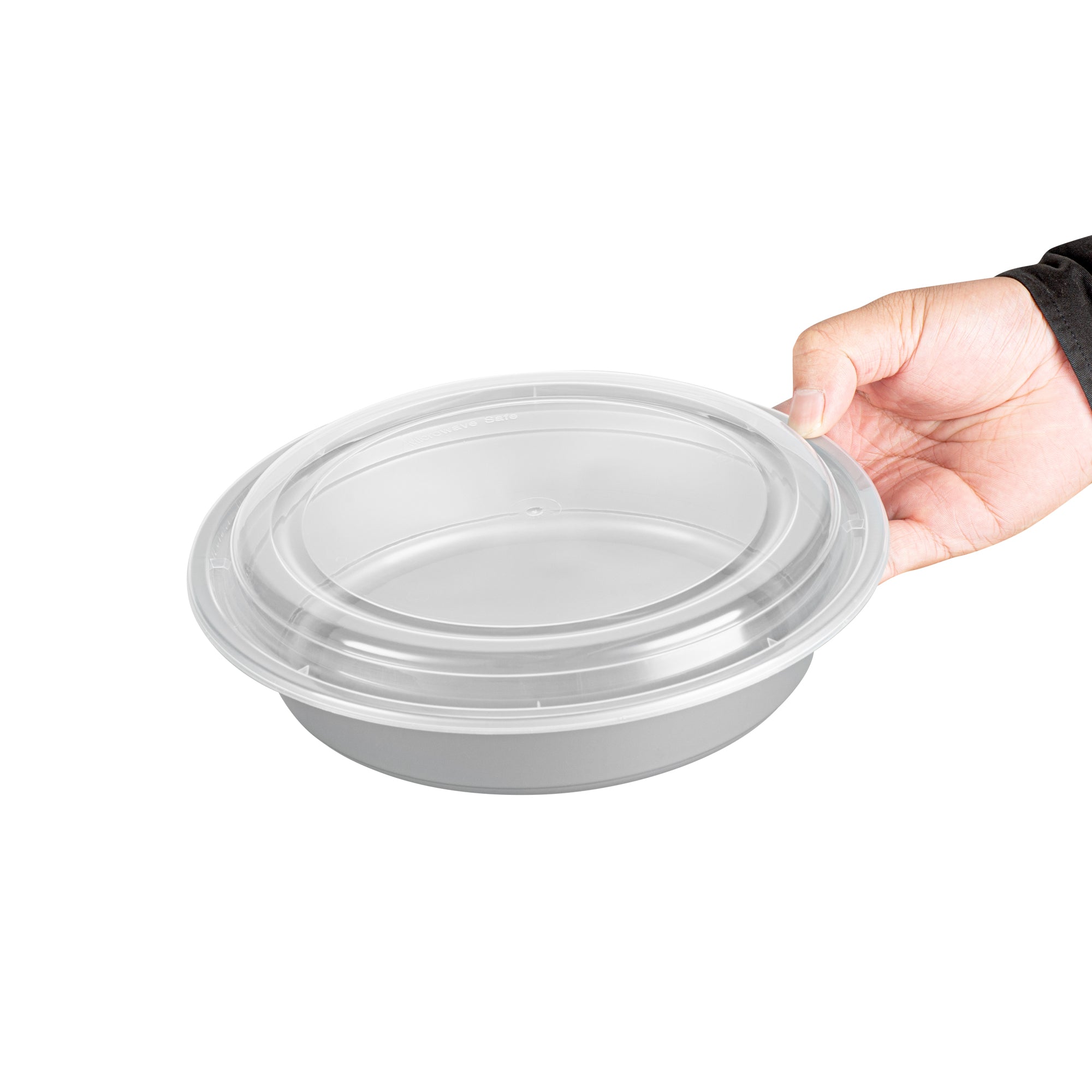 48 OZ ROUND SILVER PLASTIC TO GO BOX - WITH CLEAR LID, MICROWAVABLE