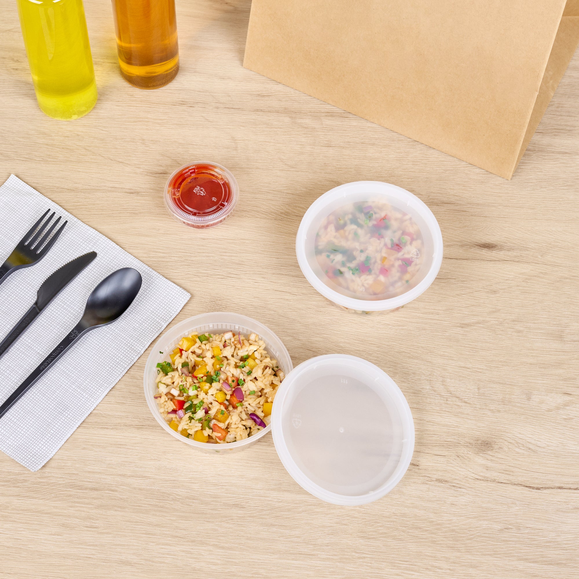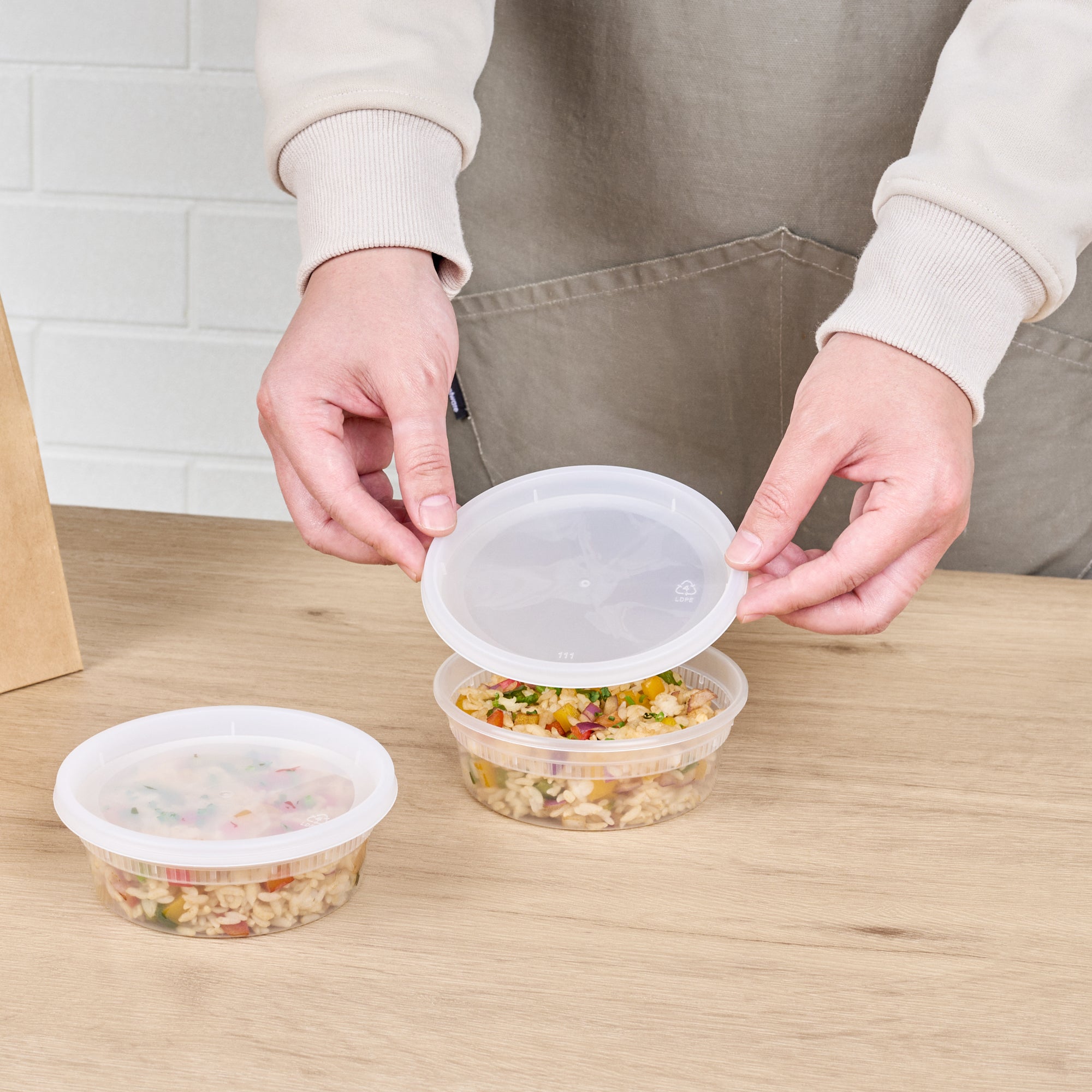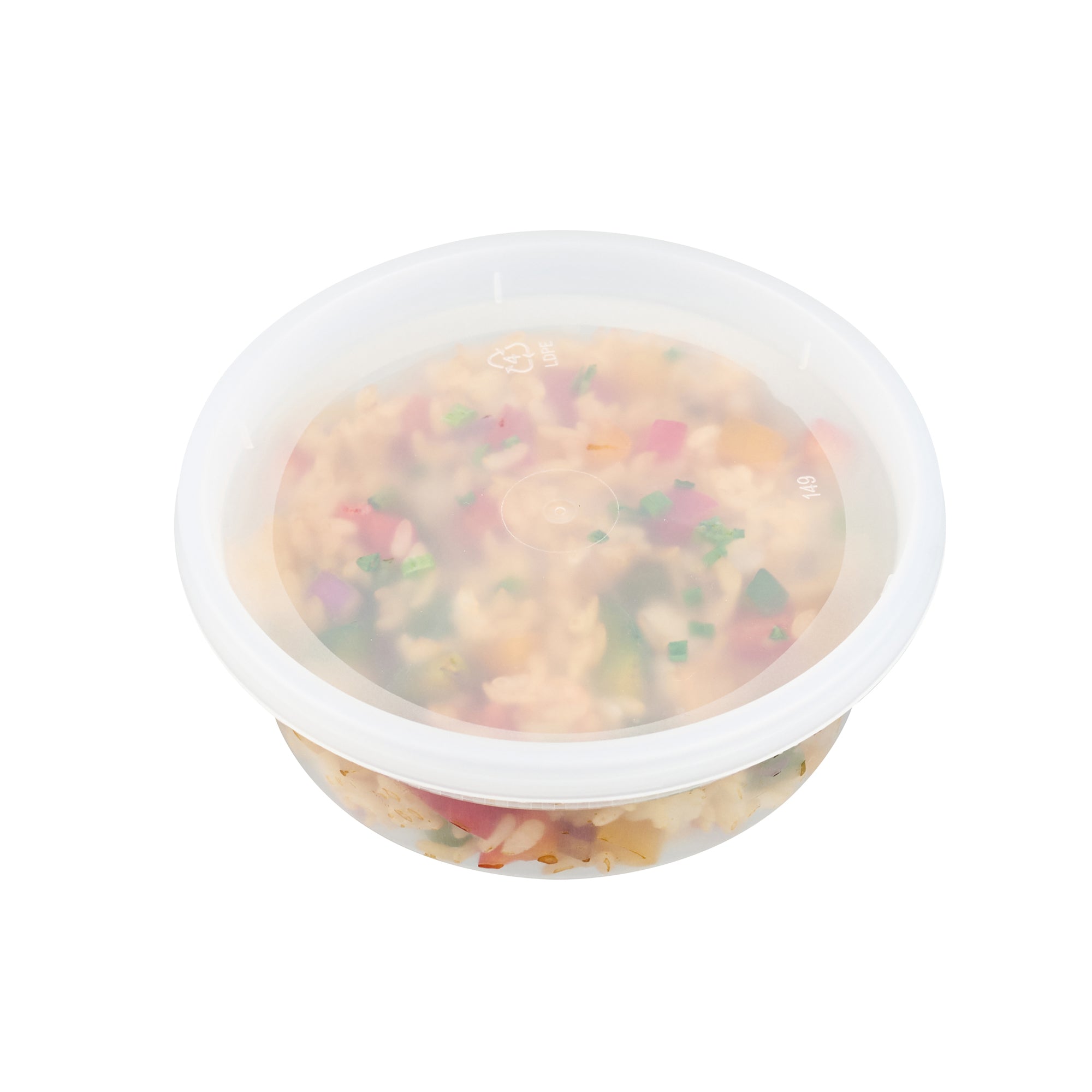 Package side dishes or snacks for take out and delivery services with our Asporto 8-ounce Round Clear Plastic Soup Containers. These transparent soup containers are created from BPA-free plastic and heat-resistant, so you can serve hot piping soups for to go orders. Each carry out container has a tight-fitting clear plastic lid that forms a secure seal for your hearty soups while preventing spills during delivery. These microwave-safe deli containers make them ideal for heating up meals without needing a different container. With a capacity of 8 ounces, these clear containers for take out provide spacious room to pack meals. These disposable food containers are recyclable to provide patrons with an ecologically responsible way to discard them after eating. With a clear finish, these round food containers showcases their contents without the need for unsealing them. Each disposable to go container measures 4.5 inches in diameter by 1.75 inches in height and has a capacity of 8 ounces. Sold in a 25 count box. NOTE: Lids are not for microwave use.