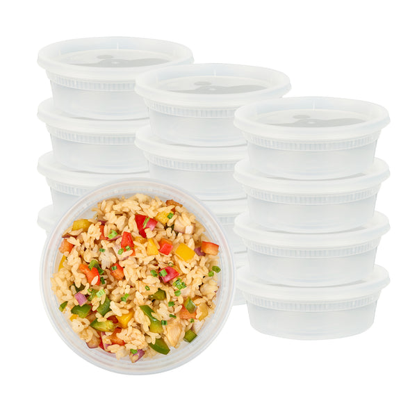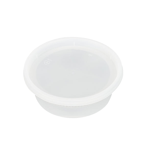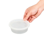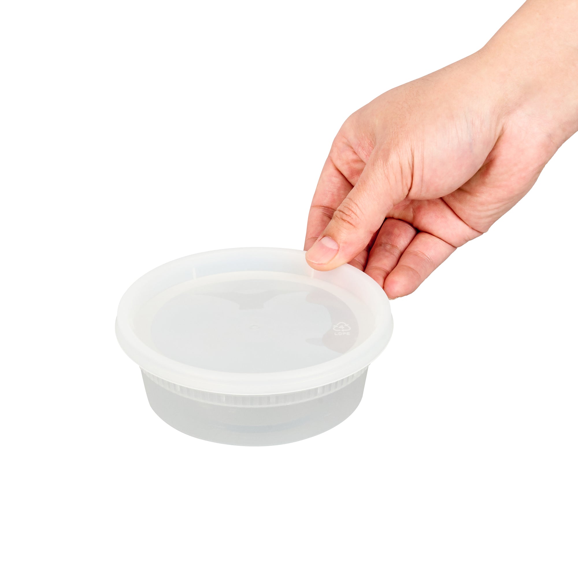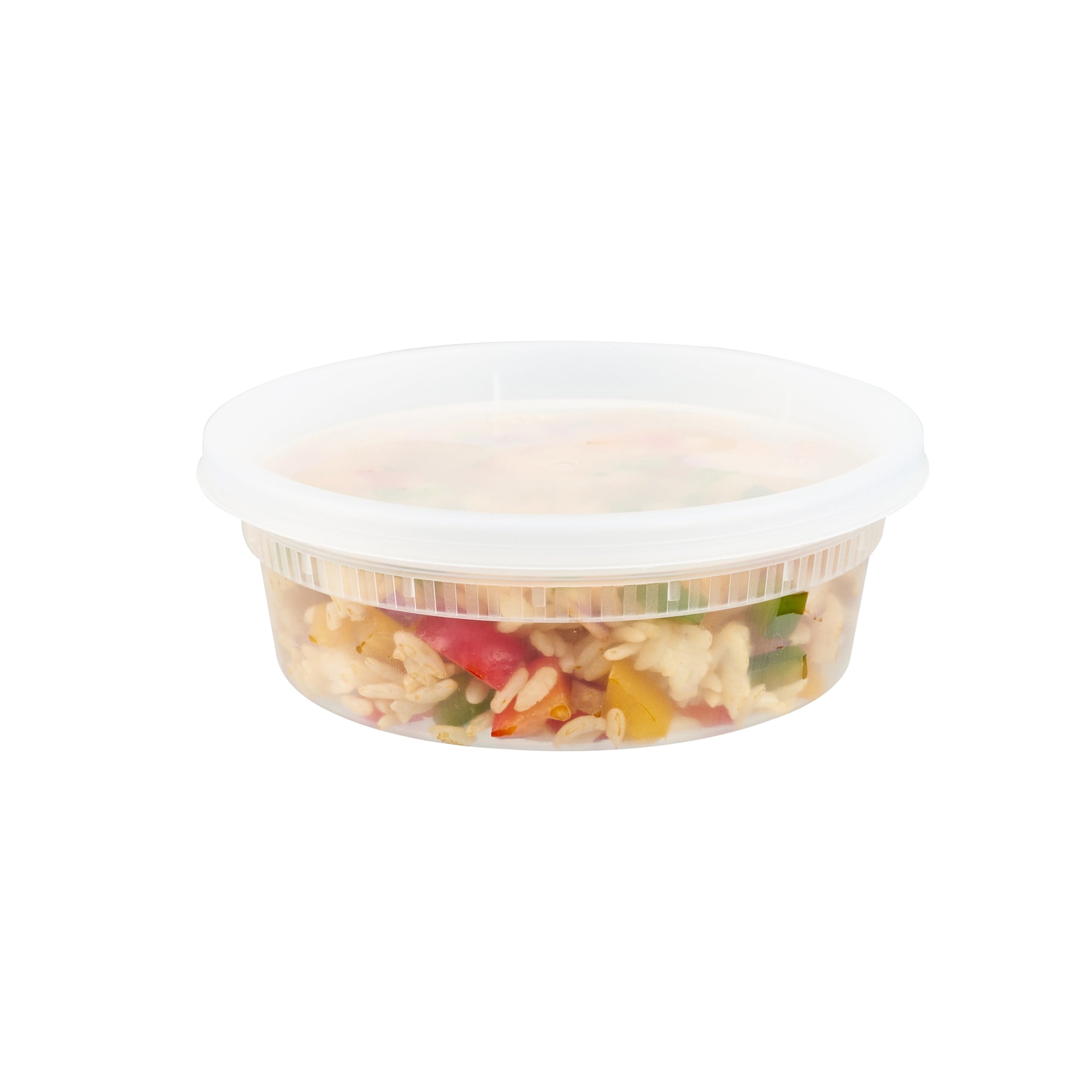 Package side dishes or snacks for take out and delivery services with our Asporto 8-ounce Round Clear Plastic Soup Containers. These transparent soup containers are created from BPA-free plastic and heat-resistant, so you can serve hot piping soups for to go orders. Each carry out container has a tight-fitting clear plastic lid that forms a secure seal for your hearty soups while preventing spills during delivery. These microwave-safe deli containers make them ideal for heating up meals without needing a different container. With a capacity of 8 ounces, these clear containers for take out provide spacious room to pack meals. These disposable food containers are recyclable to provide patrons with an ecologically responsible way to discard them after eating. With a clear finish, these round food containers showcases their contents without the need for unsealing them. Each disposable to go container measures 4.5 inches in diameter by 1.75 inches in height and has a capacity of 8 ounces. Sold in a 25 count box. NOTE: Lids are not for microwave use.