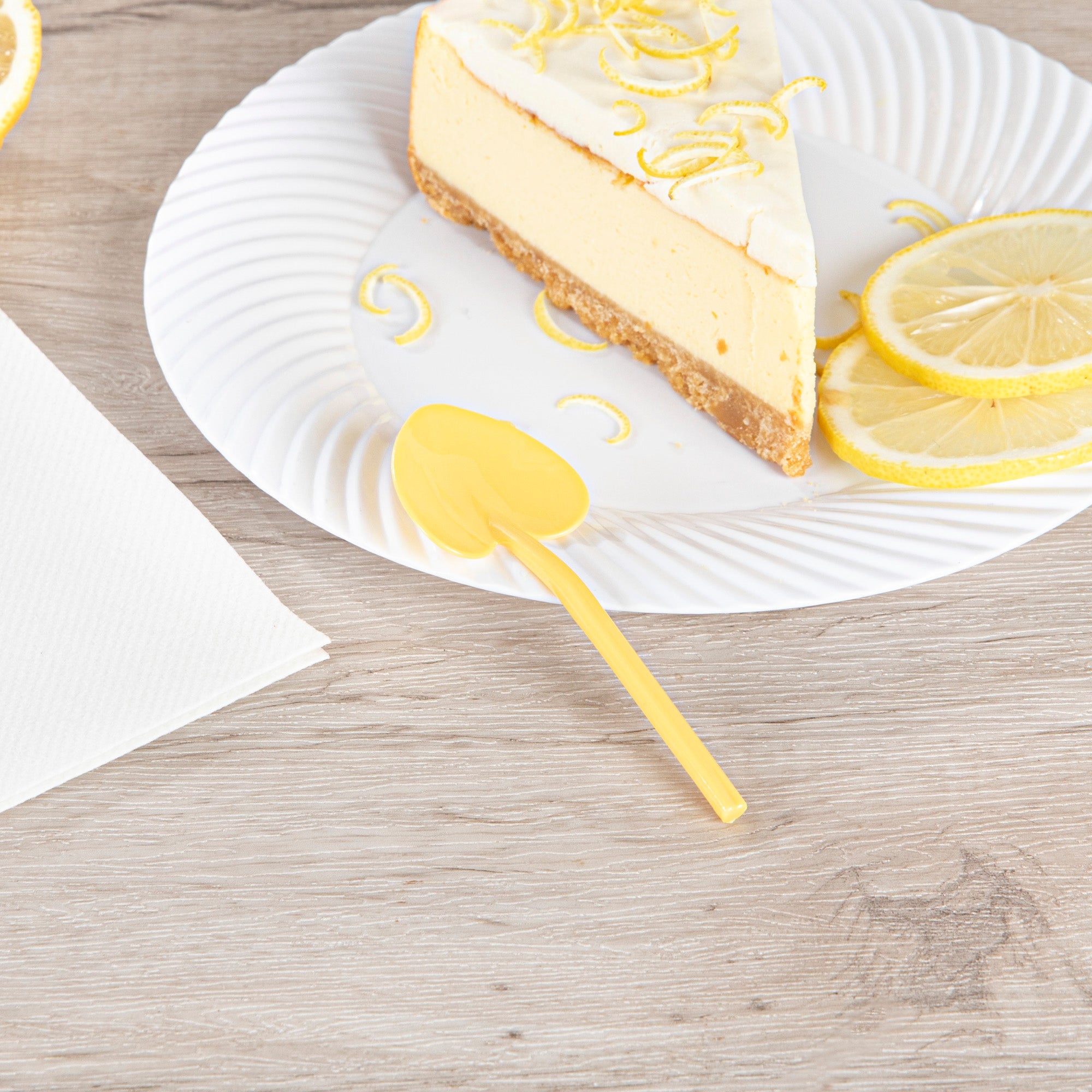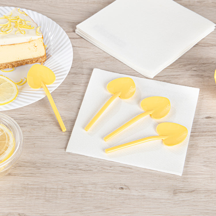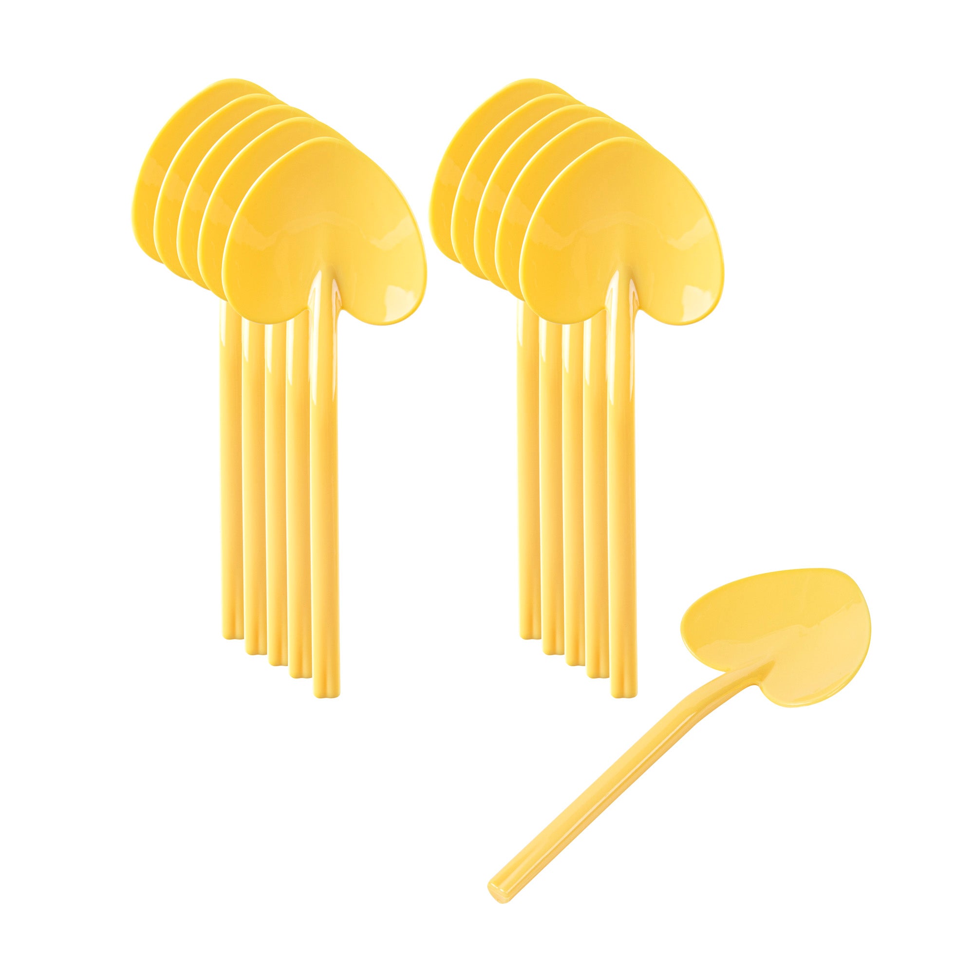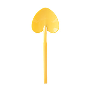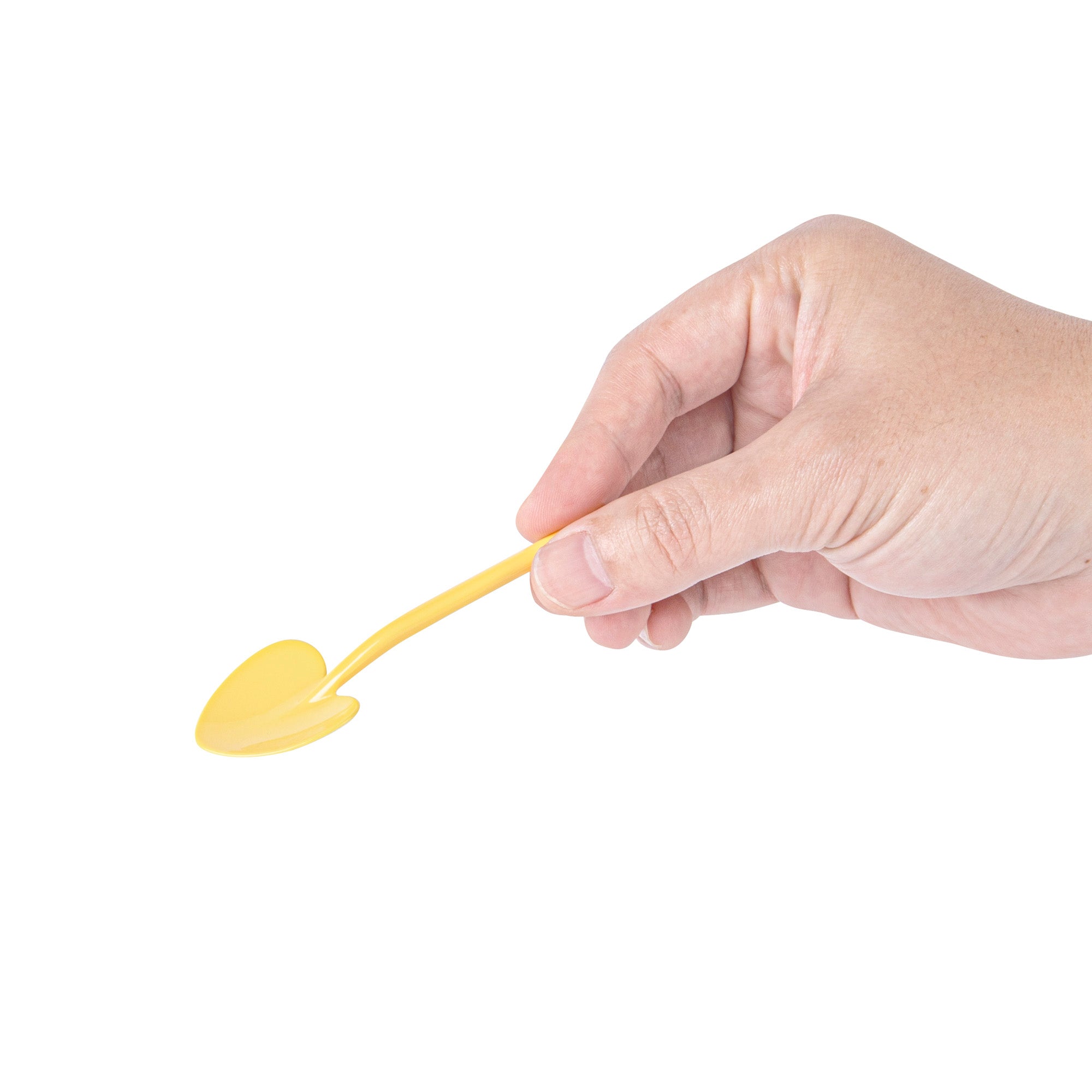 Infuse a vibrant burst of color into your sweet treats and delectable desserts with our Coppetta Baby Yellow Plastic Love Shovel Spoons. Featuring an eye-catching yellow finish, these recyclable sundae spoons will make your cups of perfectly swirled frozen yogurt and freshly scooped ice cream stand out. These spoons have a stylish shovel-shaped head that makes it easy to scoop up frozen and creamy desserts. The strong and sturdy handle of these heart shovel spoons do not bend or break while scooping ice creams from ice cream bowls. With these disposable dessert spoons, cleaning up after events is a breeze. Measuring 3.5 inches long by 1.25 inches wide, these gelato spoons perfectly brighten any table decor with their vibrant baby yellow finish. Shipped in a 500 count box.