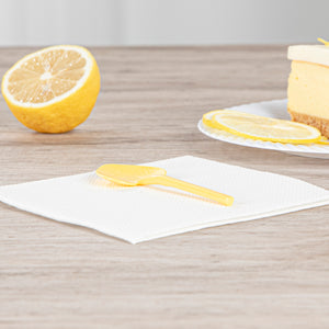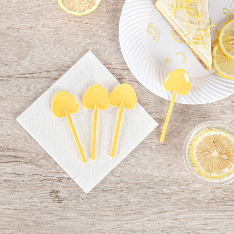Infuse a vibrant burst of color into your sweet treats and delectable desserts with our Coppetta Baby Yellow Plastic Love Shovel Spoons. Featuring an eye-catching yellow finish, these recyclable sundae spoons will make your cups of perfectly swirled frozen yogurt and freshly scooped ice cream stand out. These spoons have a stylish shovel-shaped head that makes it easy to scoop up frozen and creamy desserts. The strong and sturdy handle of these heart shovel spoons do not bend or break while scooping ice creams from ice cream bowls. With these disposable dessert spoons, cleaning up after events is a breeze. Measuring 3.5 inches long by 1.25 inches wide, these gelato spoons perfectly brighten any table decor with their vibrant baby yellow finish. Shipped in a 500 count box.