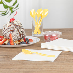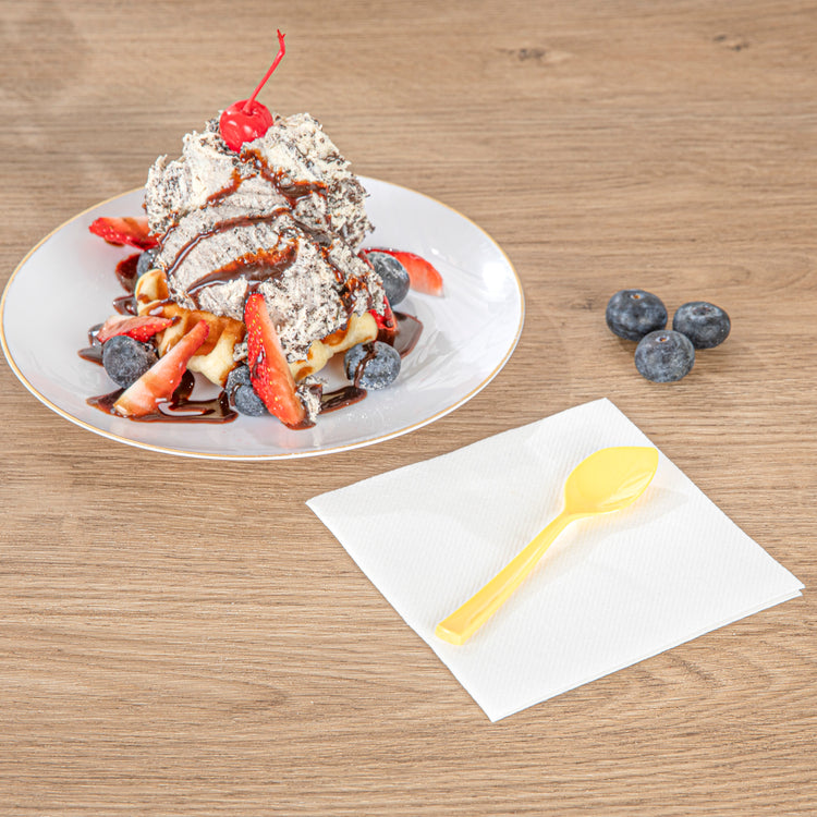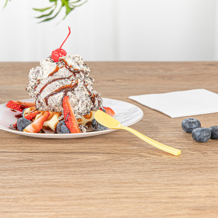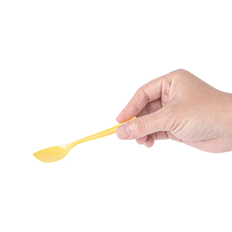 Bring a delightful pop of color to your frozen treats with our Coppetta Baby Yellow Plastic Petal Spoons. Made from premium plastic, these plastic petal spoons don't bend or break easily. The strong and sturdy handles of these disposable spoons make it easy to dig into tightly packed scoops of gelato or towering mounds of icy sorbet. These frozen yogurt spoons have a unique angled shape that ensures that your customers can scoop up every last delicious morsel. Featuring a sunny yellow finish, these plastic spoons look great inside big bowls of hand-scooped ice cream and cups of freshly swirled frozen yogurt. Each dessert spoon measures 4.5 inches in length by 1 inch in width, making them ideal for serving alongside all types of frozen treats and delectable desserts. Shipped in a 500 count box.