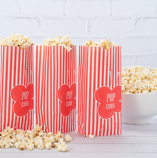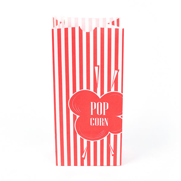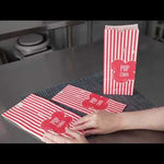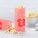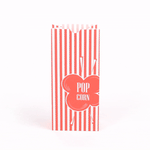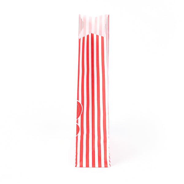 Customers can easily snack on their popcorn with our Bag Tek 1-ounce Red Paper Popcorn Bags. Featuring a red and white striped finish, these paper snack bags give your servings of popcorn a classic look. These paper food bags are tear-resistant and have a grease-resistant lining so customers can add butter to their popcorn without worry about having greasy hands. The flat bottom of these red and white paper bags makes it easy to place them on flat surfaces and fill them with popcorn. With an open-top design, these treat bags provide easy access to popcorn while on the go, making them great for food stands, festivals, and movie theaters. Plus, they can be folded down for securely containing popcorn. For quick cleanup, these paper bags can be conveniently recycled. Measuring 4.33 inches long by 2.36 inches wide by 9.44 inches tall, these red paper bags contain up to 1 ounce of popcorn. Sold in a 100 count box.