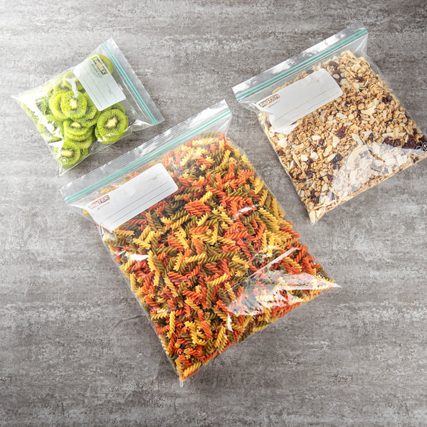 The interlocking double zipper of these zip bags for food creates a tight seal to keep air out, locking in the freshness of foods. Foods last longer!