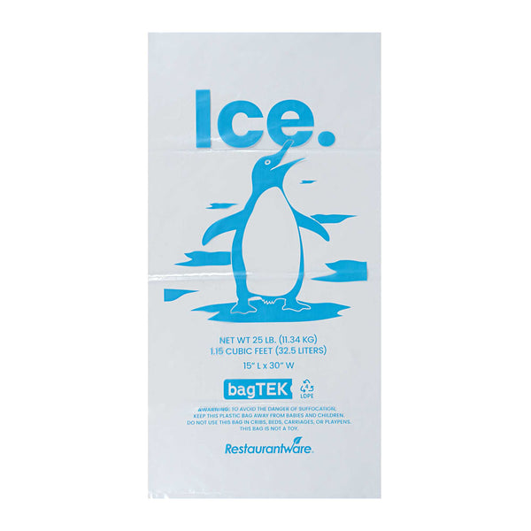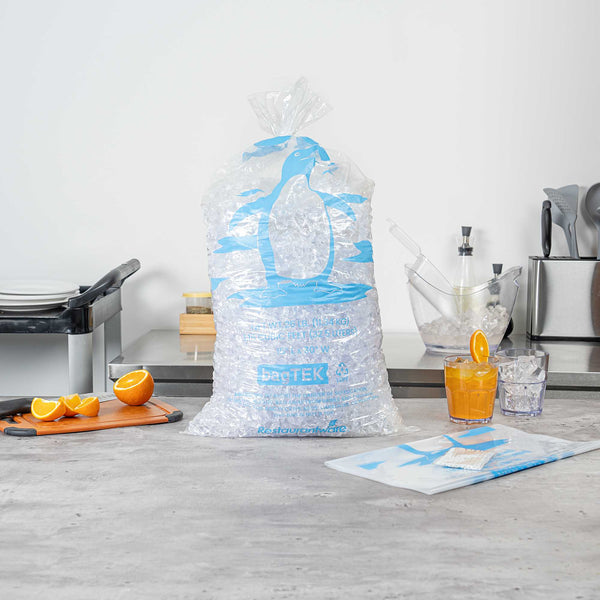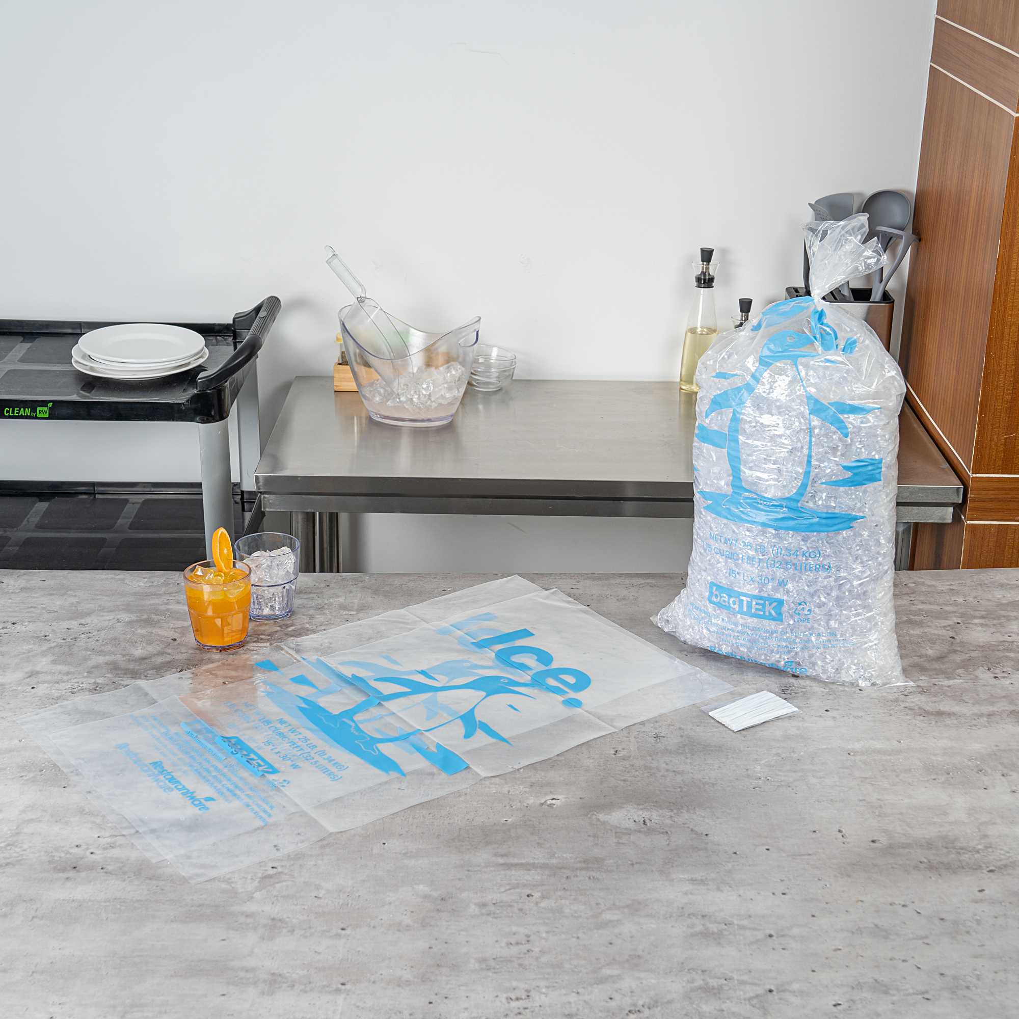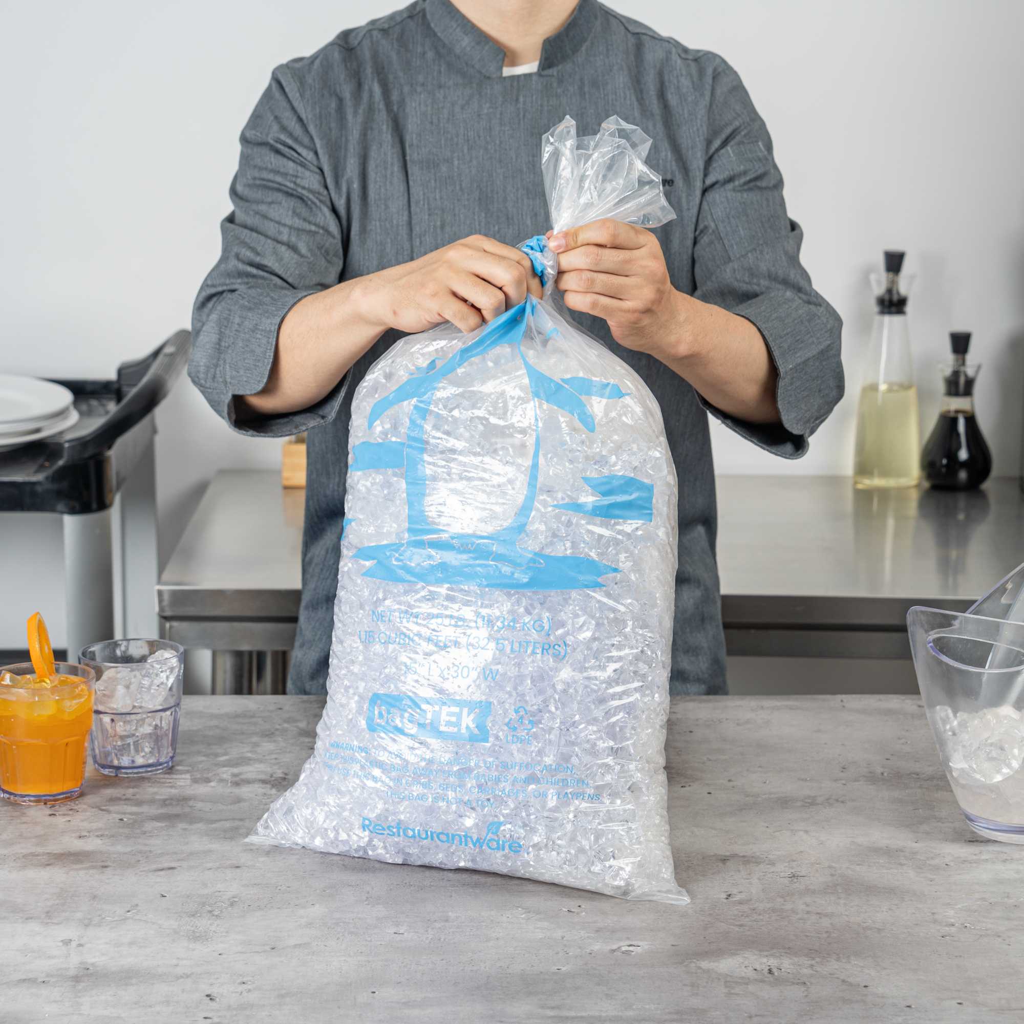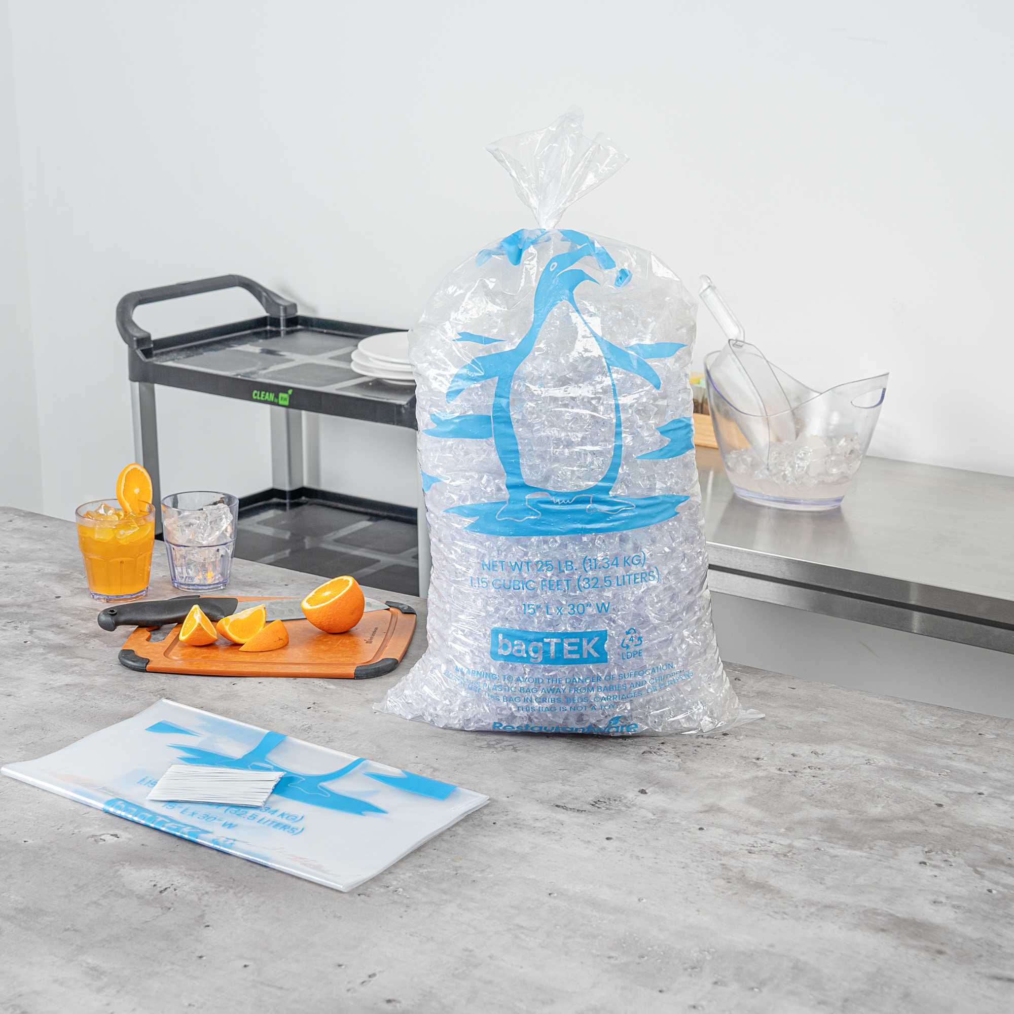 Keep ice fresh and secure with our Bag Tek Clear Plastic Ice Bags. Featuring a 25-pound capacity, these heavy-duty bags are ideal for commercial kitchens, event caterers, and ice distribution services. Made from rugged plastic reinforced with metallocene, they’re freezer-safe and highly resistant to leaks or tearing during transport. The eye-catching ice print and clear design enhance both presentation and product visibility. Each bag measures 14.96 inches in length by 30.12 inches in width to comfortably accommodate 25 pounds of ice. Sold in a 500 count box.