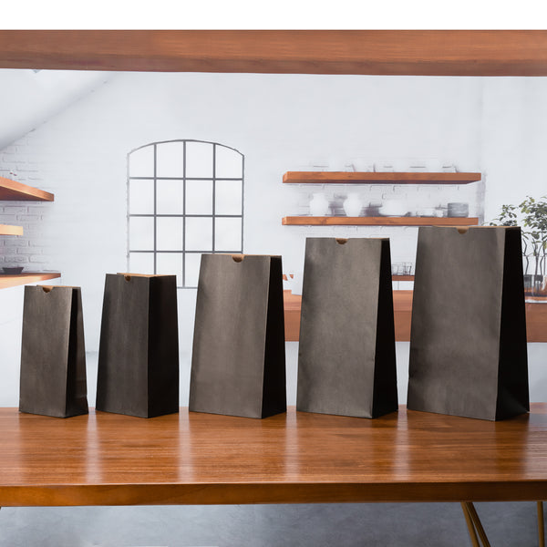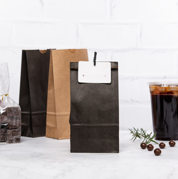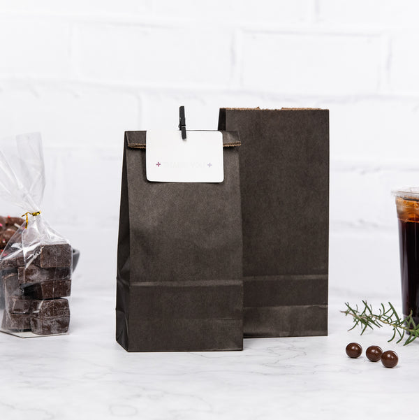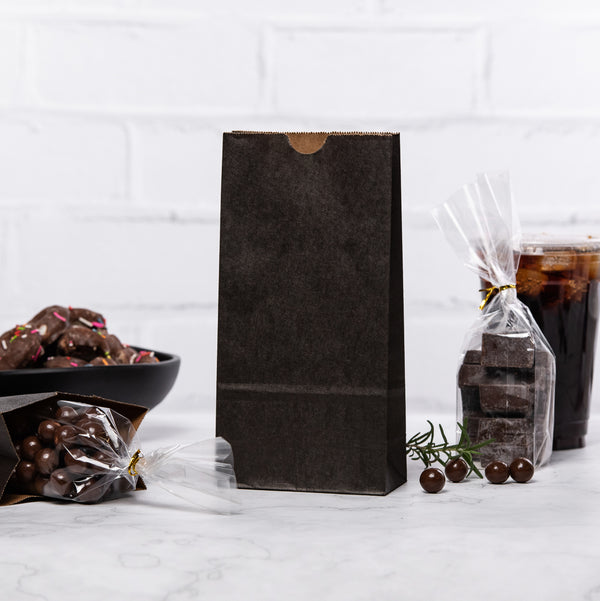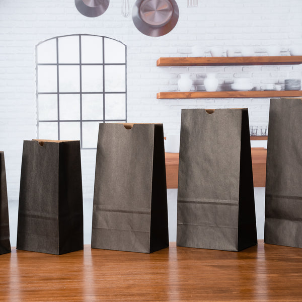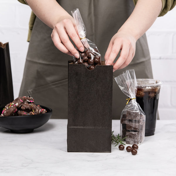 Package snacks for take out services using our Bag Tek Black Paper Bags. Featuring a flat bottom, these retail paper bags can be placed upright on flat surfaces to easily package baked goods. With an open-top design, these paper lunch bags can be rolled down to keep snacks securely contained while on the go. Constructed from high-quality paper, these paper deli bags are recyclable for an effortless way to clean up after enjoying meals. Designed with a chic black finish, these paper grocery bags seamlessly complement your existing packaging materials. These recyclable paper bags measure 4.33 inches long by 2.36 inches wide by 8.66 inches tall and can contain up to 2 pounds. Sold in a 100 count box.