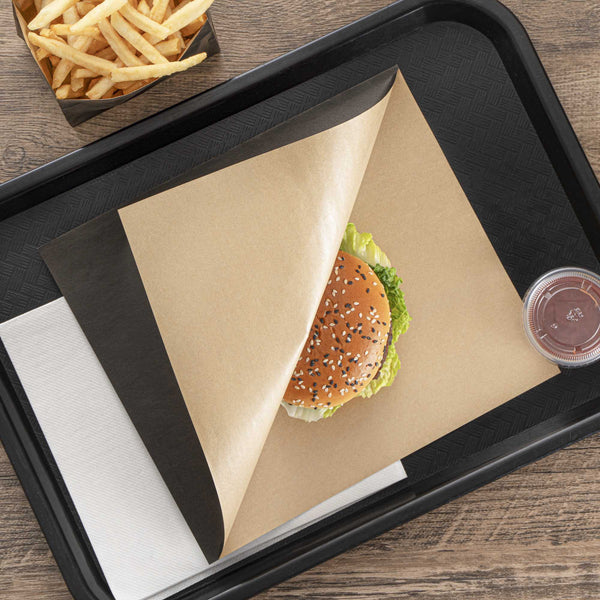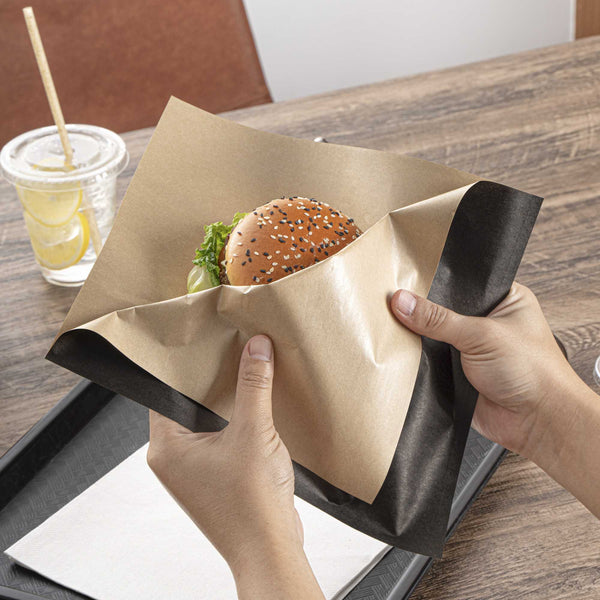 Enjoy classic sandwiches and pretzels on the go using our Bag Tek Black Paper Large Double Open Bags. Designed with a double-open construction, these paper sandwich bags make it easy to serve and carry entrees and sides. Ideal for food trucks, cafes, and restaurants, these large paper bags are greaseproof to avoid oily stains and splotches on bags. These paper burger bags have a stylish black finish that adds a modern touch to carry-out food items. The tear-resistant construction of these sturdy paper burger bags expertly keeps meals from spilling out. To quickly heat up foods for customers, these paper sandwich bags are microwave-safe for up to 2 minutes. Made from high-quality paper, these large paper food bags are recyclable for a sustainable and simple cleanup after use. These paper burger bags measure 10 inches in length by 9 inches in width to comfortably hold all kinds of foods. Sold in a 100 count box.