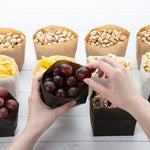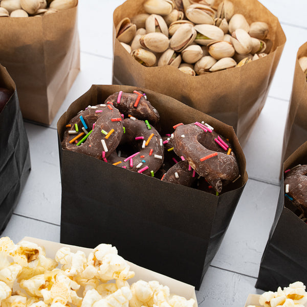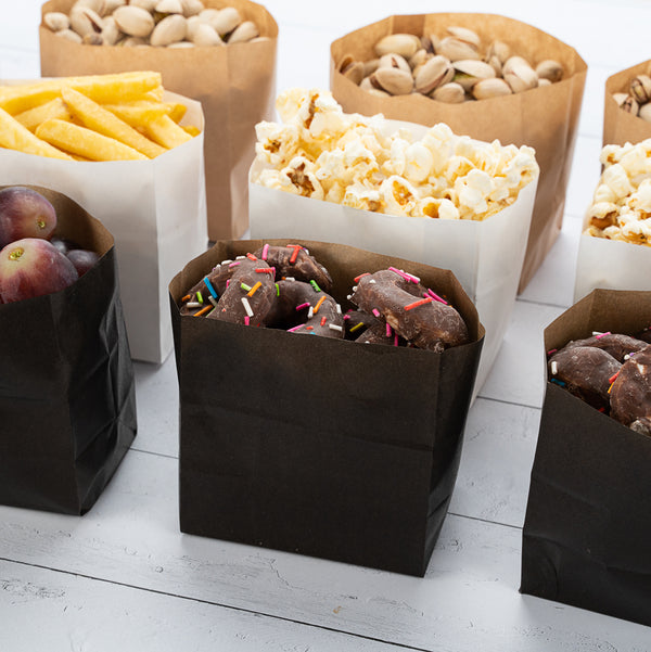 Maintain snack freshness with versatile black paper snack bags. These bags are designed to ensure mess-free serving of pastries and other treats. Their food bags construction supports both cold and hot food items, making them an ideal choice for diverse menu offerings while ensuring a sleek, modern presentation. The flat-bottom design further enhances their utility by allowing them to stand upright, facilitating easy packaging and display. Elevate your foodservice operation with these efficient and stylish snack bags. Each order includes 100 Bag Tek Black Paper Snack Bags.