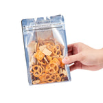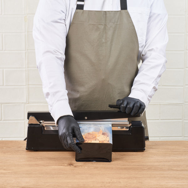 Upgrade from your standard packaging to efficient packaging with our Bag Tek Black Plastic Medium Snack Bags. With the double-sealing feature of these rip-lock bags, you can store your sweet and savory snacks for a long time while preserving their freshness. The rip lock design added with the heat sealable feature makes these plastic bakery bags secure. These heat-seal bags have a flat bottom design allowing them to stand alone without support, and are ideal for grab-and-go areas of restaurants and cafes, food stalls, and kiosks. A must-have for all kitchens, these greaseproof plastic pouches help avoid oil spills by keeping the oils and the grease from seeping through. The gussets on the sides of these plastic bakery bags enable them to hold a substantial amount of snacks. Featuring an elegant black finish to complement any setting, each large cookie bag measures 8 inches in length by 5 inches in width by 3.25 inches in height. Sold in a 100 count box.