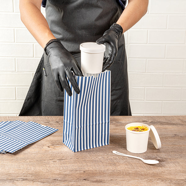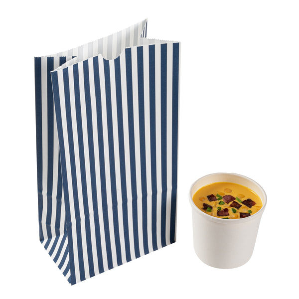 Serve your take out orders in style with our Bag Tek Blue and White Stripe Paper Bags. Crafted from high-quality paper, these disposable deli bags are durable with a grease-resistant coating to keep away oily mess. These paper deli bags are capable of securely holding up to 6 pounds of meals and treats. Featuring an open-top design, these merchandise bags ensure uncomplicated access to the contents and can be conveniently folded to carry the food spill-free. With a flat base, these popcorn bags maintain upright stability for bagging convenience. The blue and white stripes of these disposable lunch bags perfectly complements your take out collection. To easily store your leftovers, these disposable paper bags are freezer-safe.These paper take out bags are disposable for quick cleanup.Each take out bag has a capacity of 6 pounds and measures 6 inches in length by 3.5 inches in width by 10.75 inches in height. Shipped in a 100 count box.