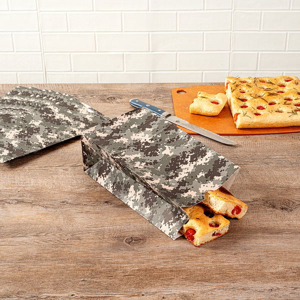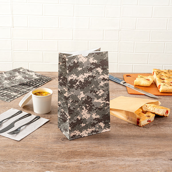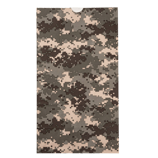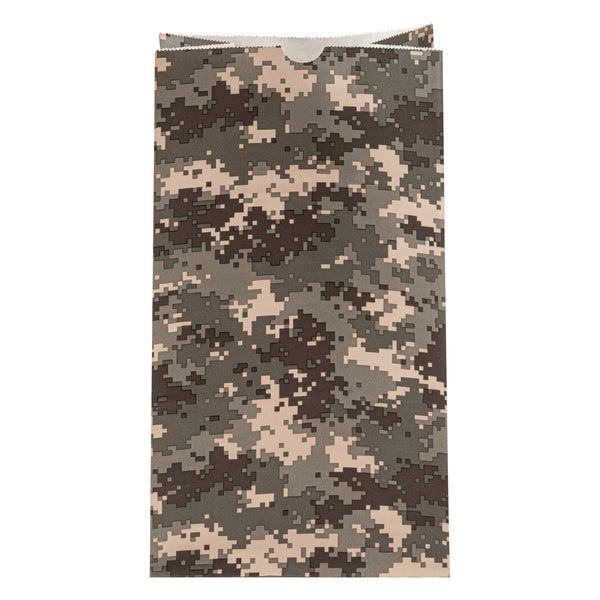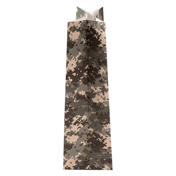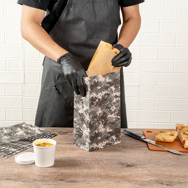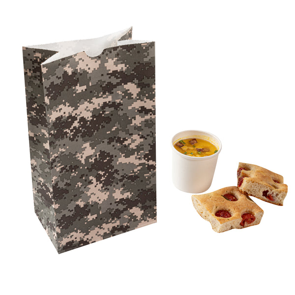 Offer customers a unique take out experience with our Bag Tek Camouflage Paper Bags. These take out bags can securely hold up to 12 pounds of your patrons' chosen meals and grocery items. Crafted from premium paper, these merchandise bags are durable and have a grease-resistant coating to keep oil or sauces from seeping through. For an easy cleanup, these popcorn bags are disposable. The standout camouflage print of these paper deli bags fits seamlessly with your take out supplies. To easily store your leftovers, these disposable merchandise bags are freezer-safe. These disposable lunch bags have an open-top design that provides easy entry, while the fold-down mechanism locks meals securely for mess-free transport. The flat-bottom construction of these camouflage paper bags ensures the bags remain stable on surfaces. Each paper grocery bag has a capacity of 12 pounds and measures 7 inches in length by 4.25 inches in width by 12.5 inches in height. Shipped in a 100 count box.