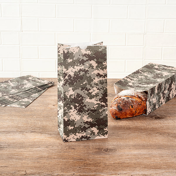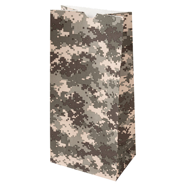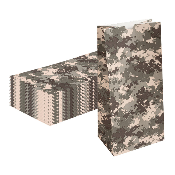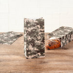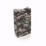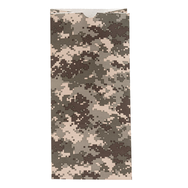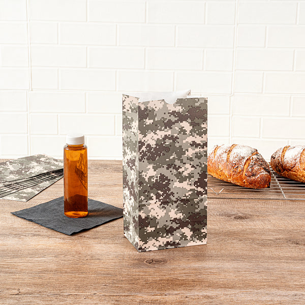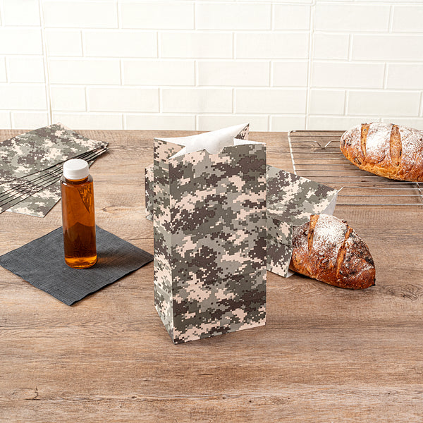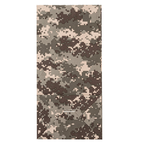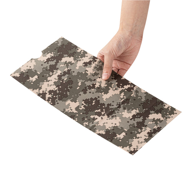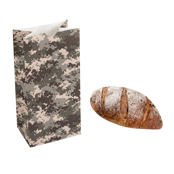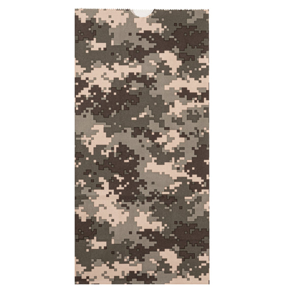 Arrange your takeaway orders in our Bag Tek Camouflage Paper Bags. These camouflage bags are capable of holding up to 8 pounds of your customers' favorite treats. Constructed from durable paper, these merchandise bags won't tear easily and have a grease-resistant coating to prevent oily or messy spills. The open-top design of these popcorn bags enables easy filling and neat folding for tidy transport. These paper deli bags have a flat bottom design that allows them to stand upright, aiding in convenient bagging. The standout camouflage print of these take out bags blends effortlessly with your takeaway materials. To easily store your leftovers, these disposable lunch bags are freezer-safe. For an easy cleanup, these grocery bags are disposable. Each camouflage take out bag has a capacity of 8 pounds and measures 6 inches in length by 4. inches in width by 11.75 inches in height. Shipped in a 100 count box.