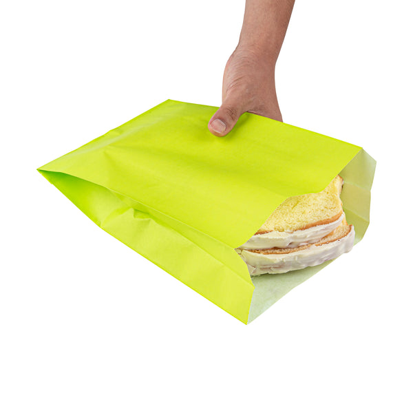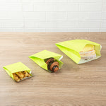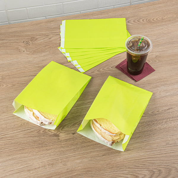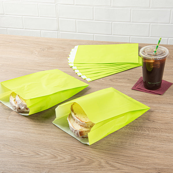 Serve finger foods using our Bag Tek Eco Green Paper French Fry / Snack Bags. Featuring a convenient open-pouch style, these goodie bags allow your customers to enjoy their snacks on the go. Designed to be greaseproof, these paper food bags are perfect for serving items like crispy onion rings or crunchy fries. The extended lip design of these snack bags separates the opening of these bags to speed up your service. These French fry bags are reliable and sturdy enough to pack a variety of food items without tearing. The green finish of these treat bags adds a pop of color to the look of your packed foods, making them appealing to patrons. Each sandwich bag measures 7 inches in length by 3 inches in width by 11 inches in height. Sold in a 100 count box.