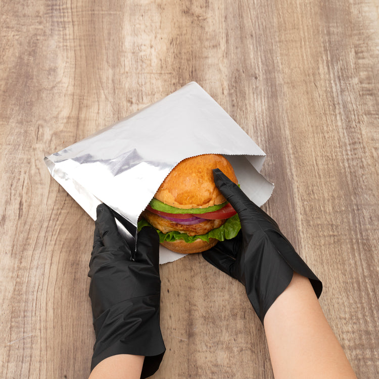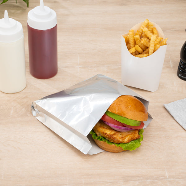 Keep burgers or sandwiches warm with our Bag Tek Foil Paper Hot Sandwich Bags. Designed with a greaseproof lining, these burger bags lock in oils to avoid messy leaks. Featuring a non-vented design, these foil deli bags conveniently provide heat and moisture retention to keep foods warm. Constructed from high-quality paper and laminated foil, these sandwich bags are freezable for easily storing leftovers. With a stylish silver finish, these foil food bags effortlessly match your establishment's food packaging supplies. These foil-lined bags have a total measurement of 7.75 inches in length by 1.75 in width by 7.75 inches in height. Sold in a 100 count box.