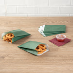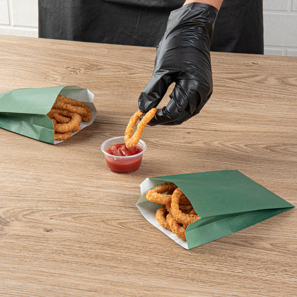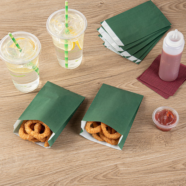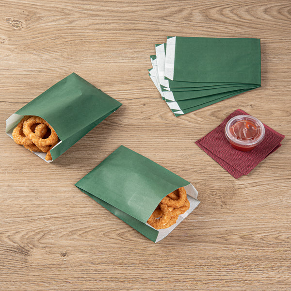 Serve your guests fries, chips, and other treats with our Bag Tek Forest Green Paper French Fry / Snack Bags. Crafted from high-quality paper, these French fry bags are greaseproof, preventing messes from oil or grease seepage. The open-pouch style of these snack bags allows patrons to easily access their snacks for enjoyable finger-food dining. Featuring an extended lip, these paper snack bags streamline your serving process by making them easy to open. The attractive forest green finish of these paper food bags complements your take out supplies perfectly. To quickly cleanup, these popcorn bags are disposable. Each forest green bag measures 4.25 inches in length by 1.5 inches in width by 6.25 inches in height. Sold in a 100 count box.