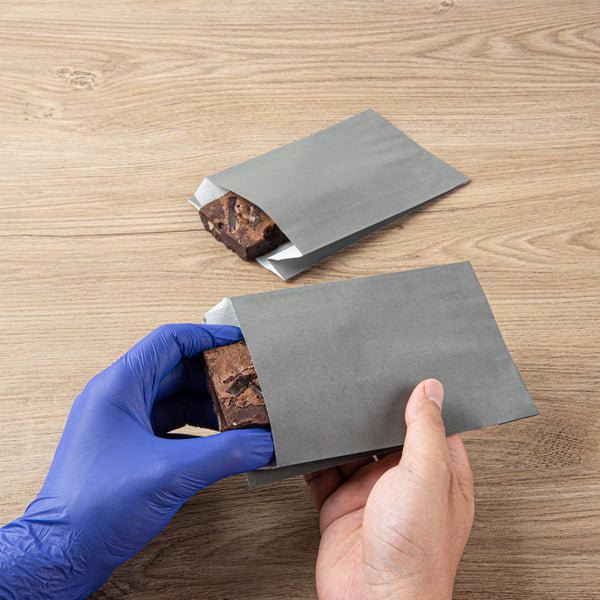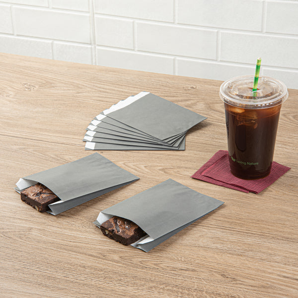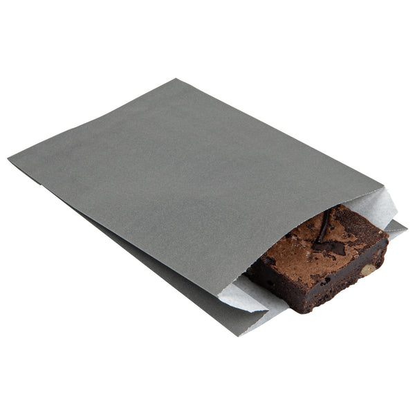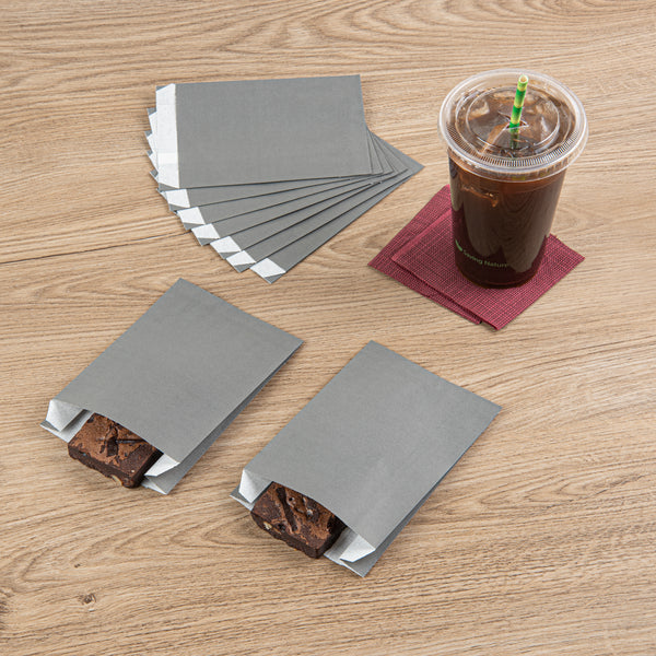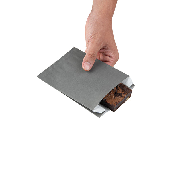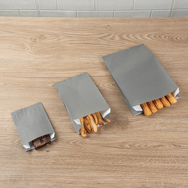 Offer fries, chips, and snacks with sophistication using our Bag Tek Gray Paper French Fry / Snack Bags. Created with premium paper, these snack bags are greaseproof, keeping oils and greases from creating messes. The open-pouch design of these goodie bags provides easy access to snacks for guests' finger food enjoyment. With an extended lip, these paper food bags are easy to open up to quickly pack snacks. The chic gray finish of these treat bags flawlessly matches your take out supplies. These gray snack bags are disposable to facilitate an easy cleanup. Each paper snack bag measures 4.25 inches in length by 1.5 inches in width by 6.25 inches in height. Sold in a 100 count box.
