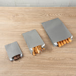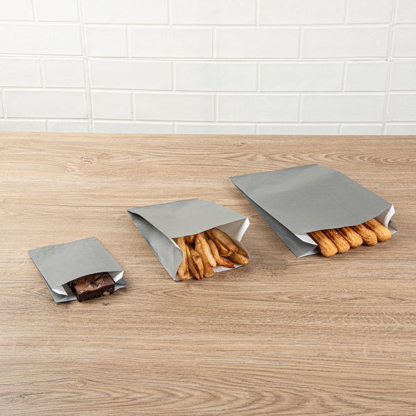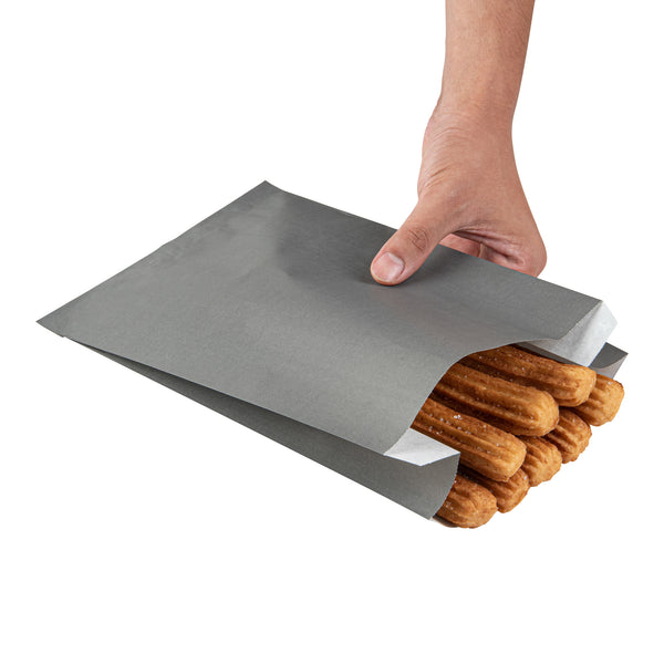 Serve your delightful snacks with our Bag Tek Gray Paper French Fry / Snack Bags. These snack bags feature an open-pouch design to allow customers to conveniently enjoy their appetizers on the go. Perfect for serving oily snacks like fries or onion rings, these paper food bags are greaseproof to keep oil or grease from seeping through during delivery. These treat bags feature an extended upper lip that can be separated quickly, making your service process more efficient. For a swift cleaning experience, these goodie bags are disposable. The gray finish of these French fry bags adds a touch of elegance to your packed snacks, making them appealing. These gray snack bags measure 7 inches in length by 3 inches in width by 11 inches in height. Sold in a 100 count box.