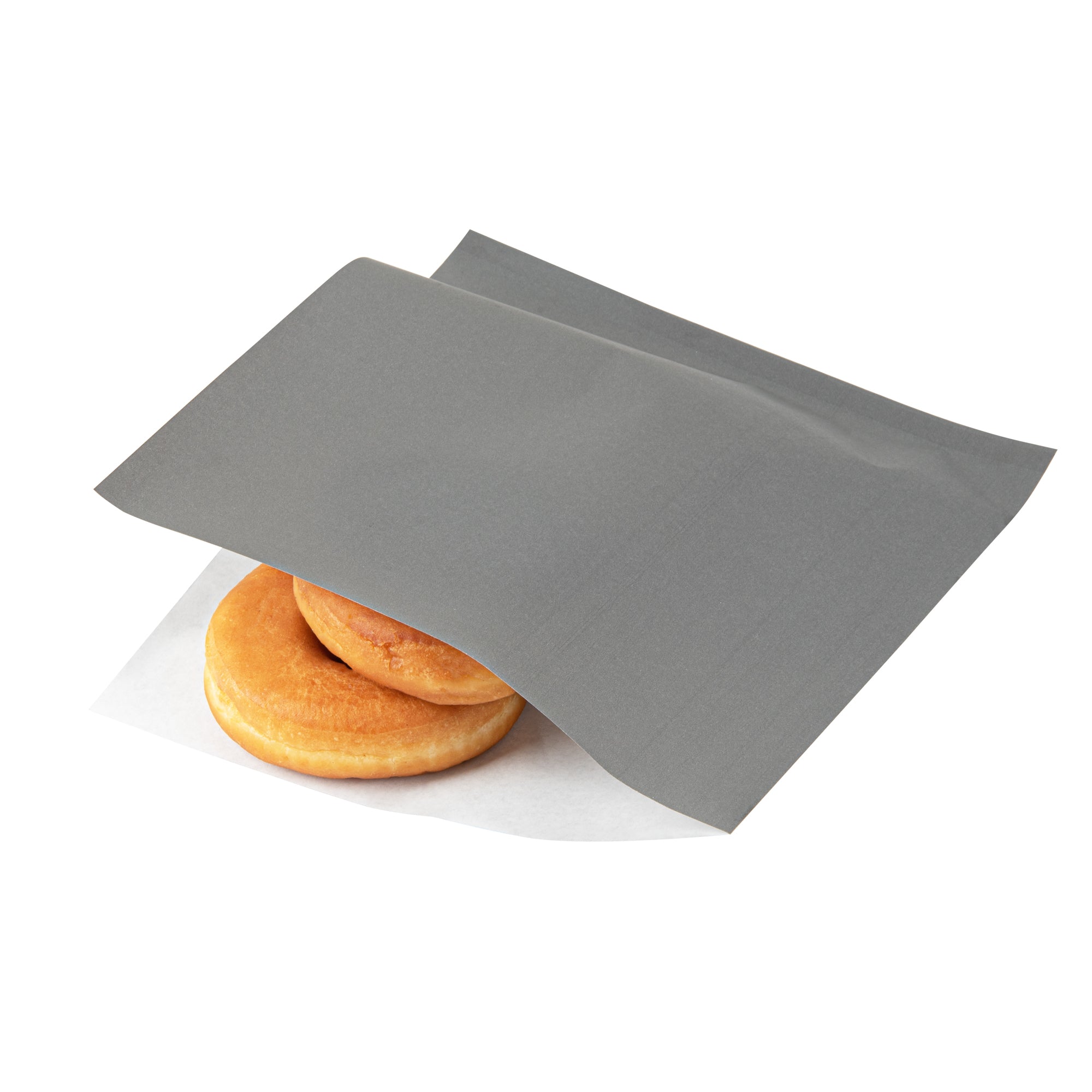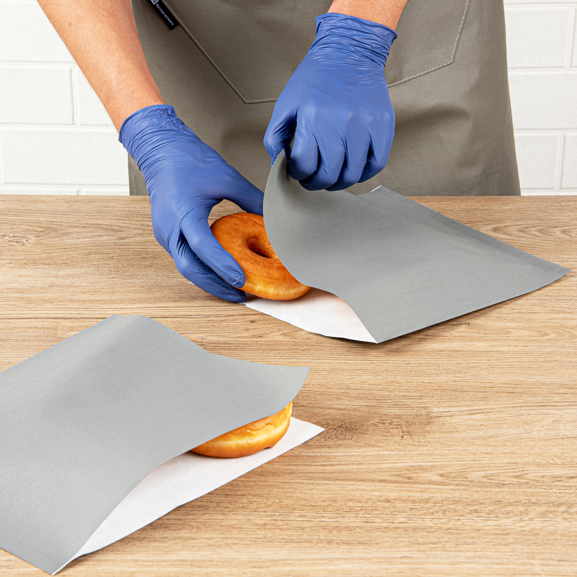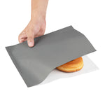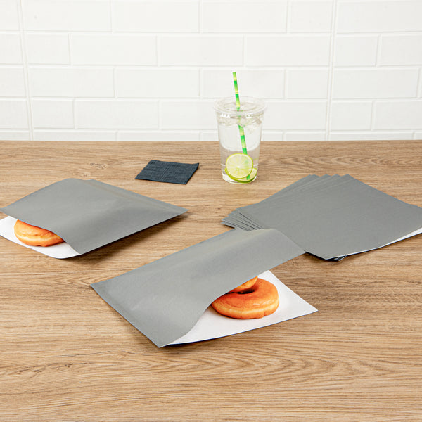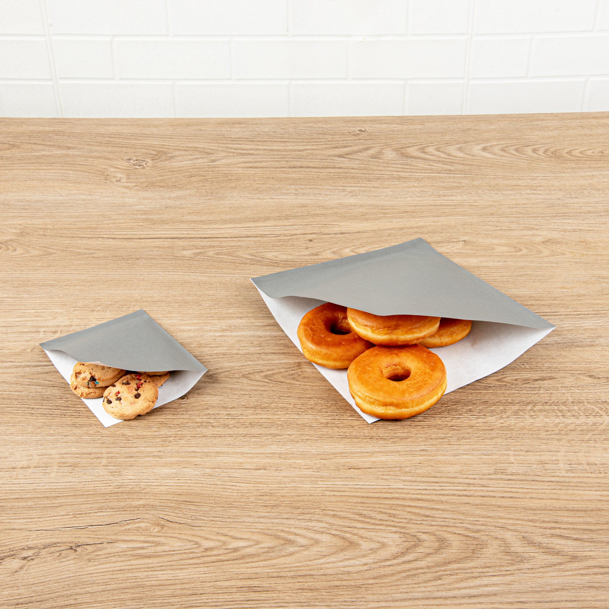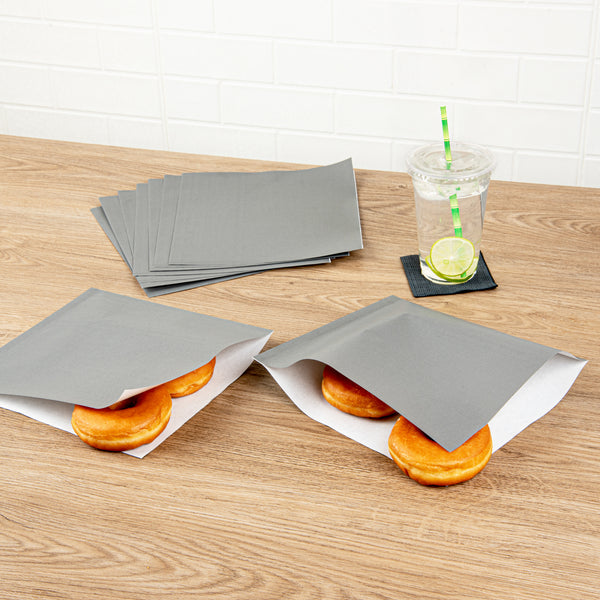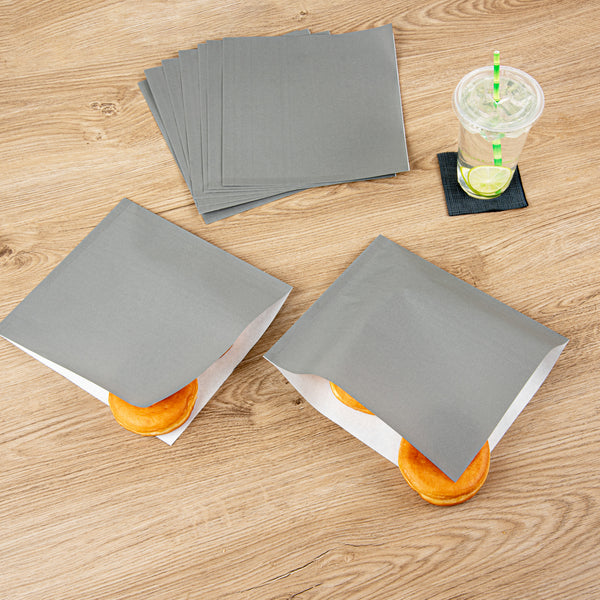 Present your treats in Bag Tek Gray Paper Large Double Open Bags. These sandwich wrappers are constructed from high-quality paper and sport a dual-open design that is convenient for packing for quick snacks or making foods easy to hold for guests. The elegant gray shade of these microwave-safe bags adds a touch of sophistication to enhance the visual appeal of food presentations. Designed with a greaseproof PE lining, these deli wrap liners effectively prevent oils from seeping through and causing any mess. For reheating of meals, these paper snack wraps can be safely microwaved for up to 2 minutes. These double-open bags are also recyclable, showcasing your foodservice establishments commitment to eco-friendly practices. Each deli paper sheet measures 10 inches in length by 9 inches in width. Shipped in a 100 count box.