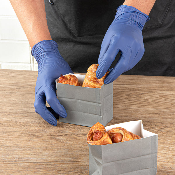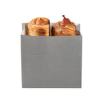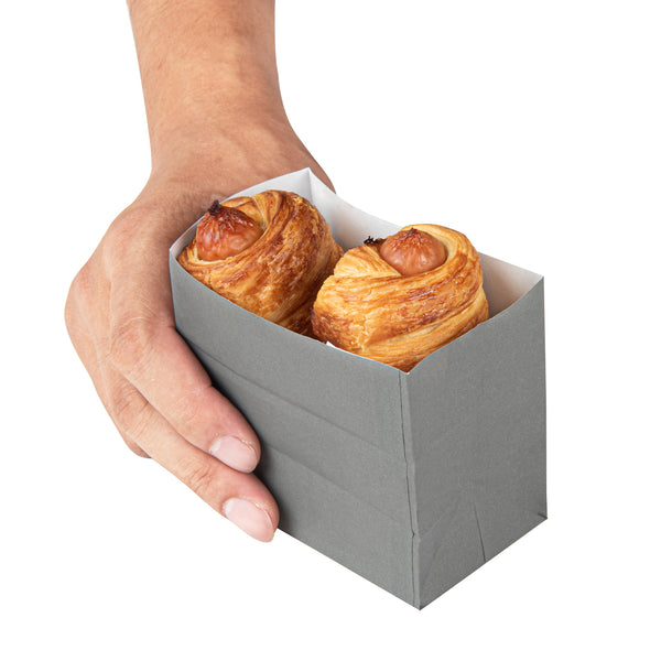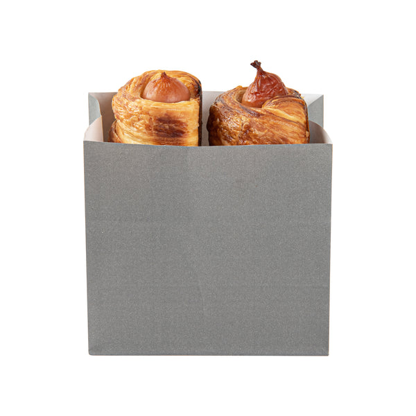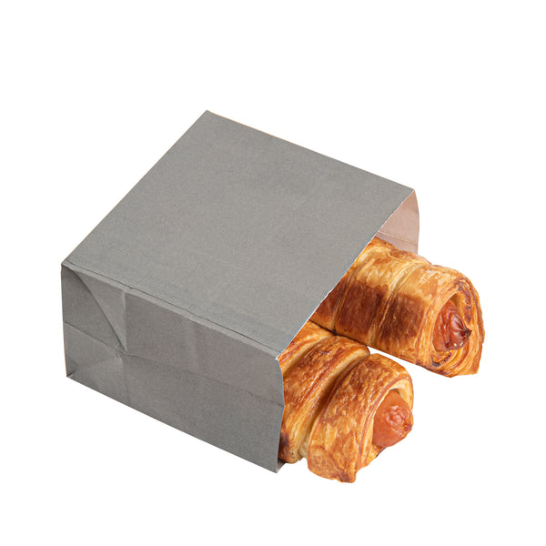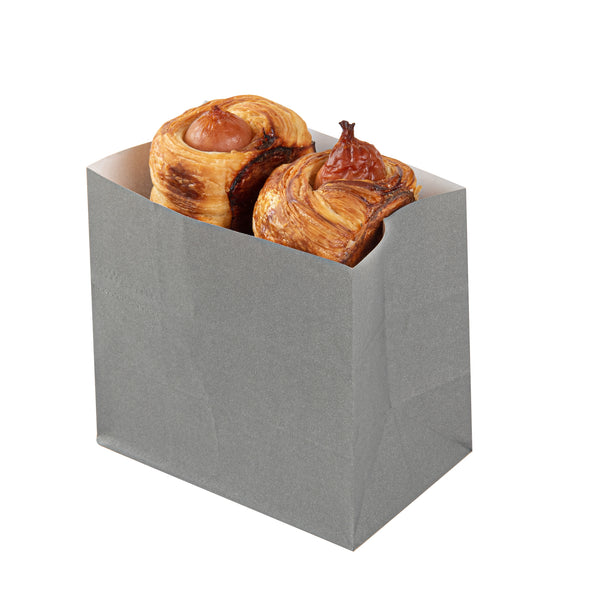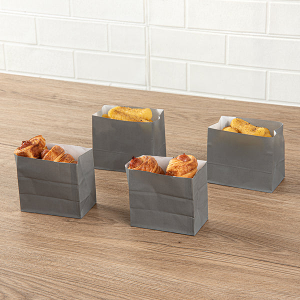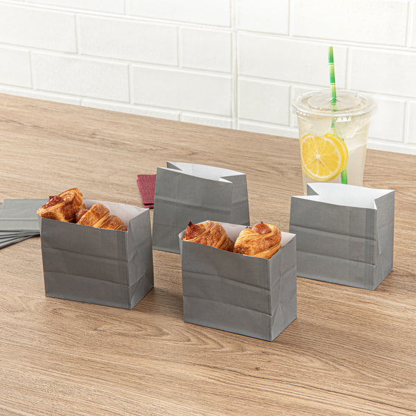 Maintain snack freshness with versatile gray paper snack bags. These bags are designed to ensure mess-free serving of pastries and other treats. Their food bags construction supports both cold and hot food items, making them an ideal choice for diverse menu offerings while ensuring a sleek, modern presentation. The flat-bottom design further enhances their utility by allowing them to stand upright, facilitating easy packaging and display. Elevate your foodservice operation with these efficient and stylish snack bags. Each order includes 100 Bag Tek Gray Paper Snack Bags.