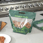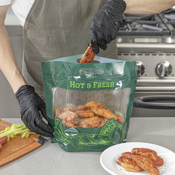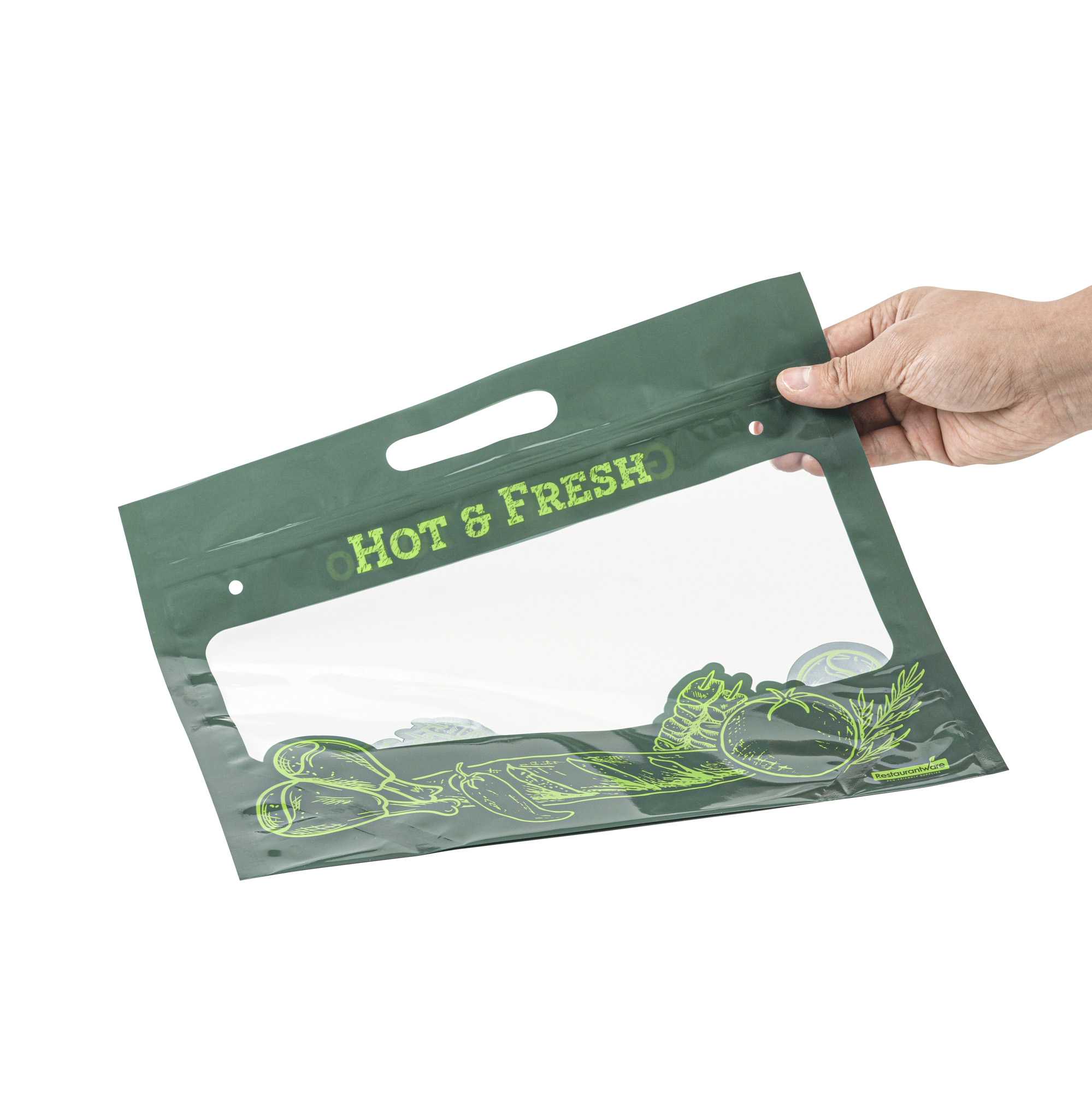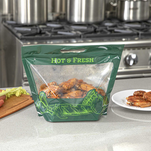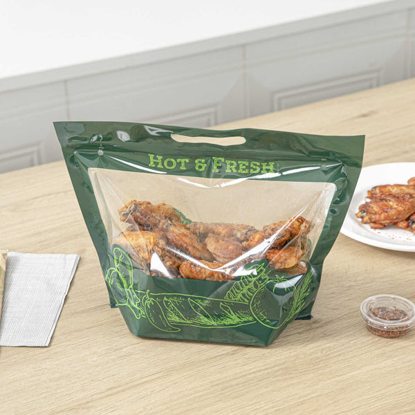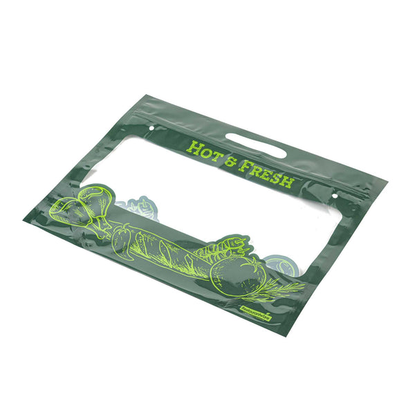 Carefully encase your freshly prepared rotisserie chicken in our Bag Tek Green Plastic Rotisserie Chicken / Hot Food Bags. These hot food bags are an excellent choice for delis, self-serve eateries, and casual dining, offering heat insulation to keep dishes piping hot while in transit. Boasting a clear panel at the front for easy meal identification, these hot delivery bags have small venting holes for steam to escape. When carrying rotisserie chicken or roasted turkey, these food delivery bags come with robust handles for ease. These rotisserie chicken bags come with a zipper mechanism for simple opening and quick resealing, making sure the hot items inside stay fresh. Constructed from superior plastic, these food storage bags are greaseproof and leakproof to avoid any untidiness. These hot bags offer a stylish green finish for an attractive meal presentation. You can use these plastic bags in the microwave for effortless reheating of food. Measuring 12.75 inches in length by 5.75 inches in width by 10.25 inches in height, these bags can amply accommodate substantial portions of chicken wings, ribs, roast turkey, and more. Shipped in a 100 count box.