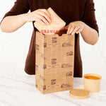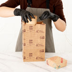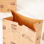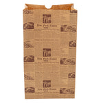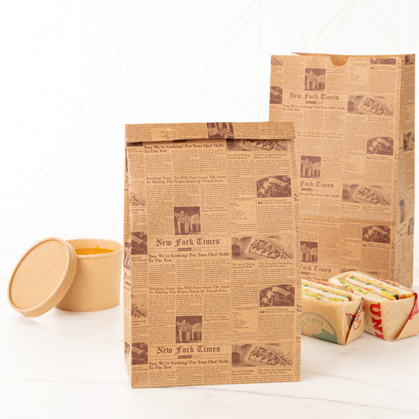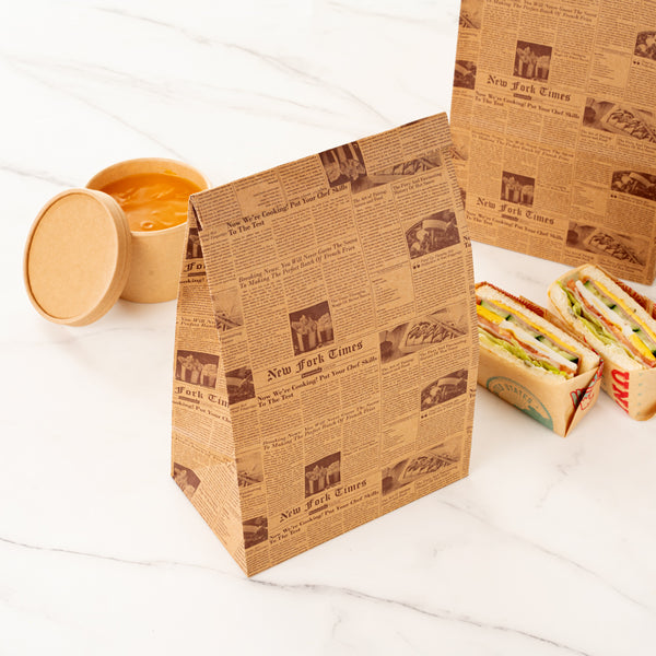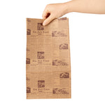 Conveniently pack your guests' meals by using our Bag Tek Kraft Newsprint Paper Bags. The premium build of these paper bags for food makes them durable to hold hefty food items without ripping. The newsprint design of these kraft bags gives a classic appeal to your food items. Conveniently retaining oils and sauces, these paper sandwich bags provide your customers with a smooth take out experience. The open-top design of these brown paper bags allows you to pack long food items, like tall bread. Made from kraft material, these newsprint paper bags are conveniently microwavable and freezable for your convenience. These brown paper bags are sustainable and can be conveniently disposed of after use to speed up your cleanup process. With a rectangular flat bottom, these paper bags without handles can be placed upright without tripping. The gusset sleeves on the sides of these kraft paper bags allow you to extend them, providing more space to pack your food. Measuring 7 inches in length by 4.25 in width by 12.5 Inches in height, these grocery paper bags can hold up to 12 pounds. Sold in a 100 count box.