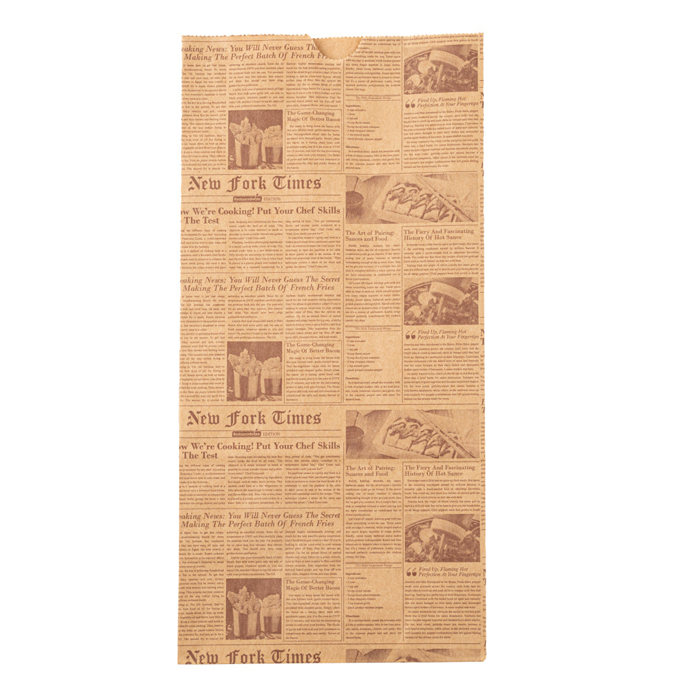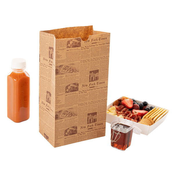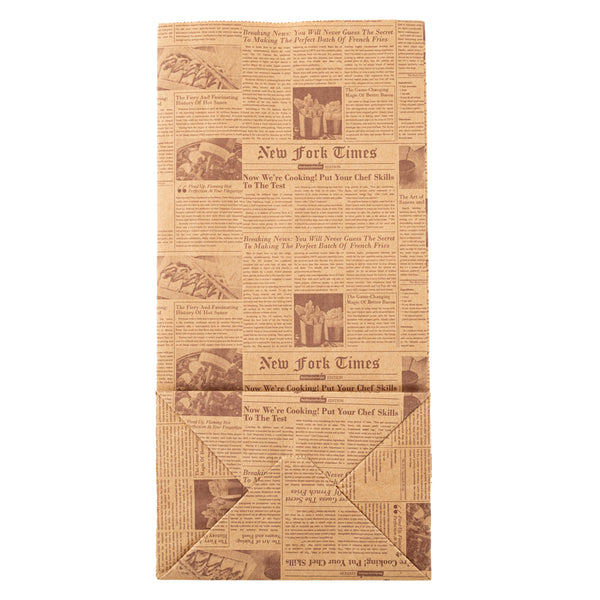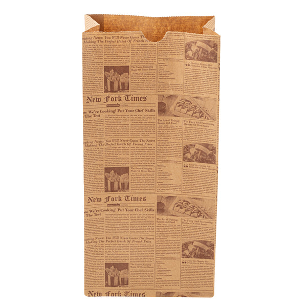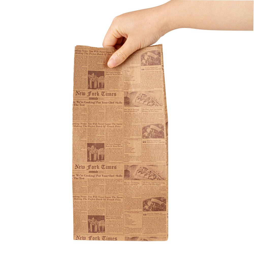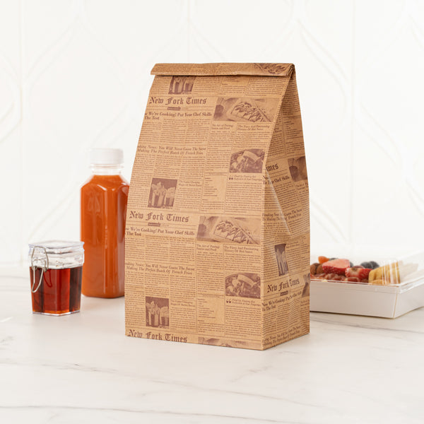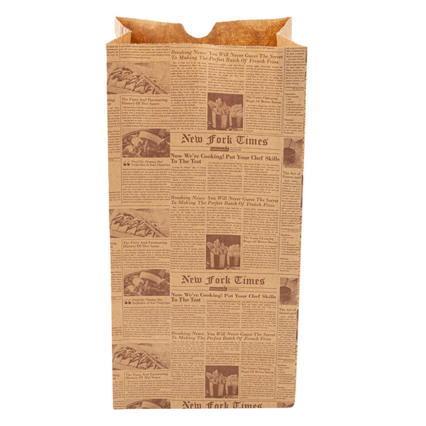 Keep your meals fresh and warm for a long time by using our Bag Tek Kraft Newsprint Paper Bags. These brown paper bags are manufactured from premium kraft material, allowing them to have the durability to hold hefty meals. With an elegant newsprint design, these paper bags without handles add a unique touch to your takeaway orders. For a comfortable on-the-go meal experience, these brown paper lunch bags withstand grease and oils. Featuring an open-top design, these grocery paper bags allow you to carry tall food items. Conveniently microwavable and freezable these newsprint paper bags let your guests store or reheat your foods. Easily dispose of these paper sandwich bags after use, as they are sustainable and speed up your post-event cleanup. These stand-on-shelf kraft bags have a rectangular flat bottom, allowing them to stand steady on tables when you pack orders. To make these paper lunch bags more spacious, they are made with gusset sleeves on the sides. With a capacity to hold 8 pounds, these kraft paper bags measure 6 inches in length by 4 inches in width by 11.75 inches in height. Shipped in a 100 count box.