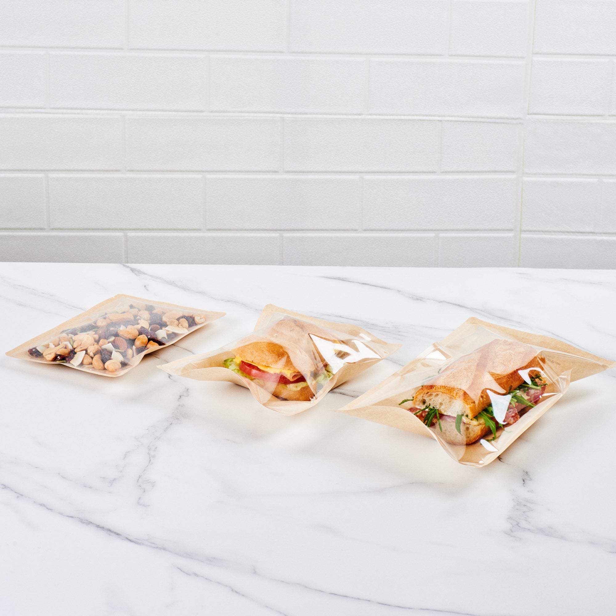 Keep an ample amount of snacks with you at all times with our Bag Tek Kraft Plastic Large Sandwich and Snack Bags. Featuring a heat sealable design, these food storage bags are airtight, keeping the content in the bags to remain fresh for longer. The clear window of these snack bags allows the customers to see what is inside and get the trail mix, candy mixes, or chocolate assortments that they like without opening the bag. These snack bags are greaseproof and do not let oils and grease penetrate, avoiding messes. The sturdy and durable construction of these sandwich bags makes them ideal for takeaways. Convenient to use, these plastic bags for candies can easily be disposed of after use. These bags for bakeries are disposable, making the disposal process easy. Each disposable snack bag measures 11.5 inches in length by 6.75 inches in width. Sold in a 100 count box.