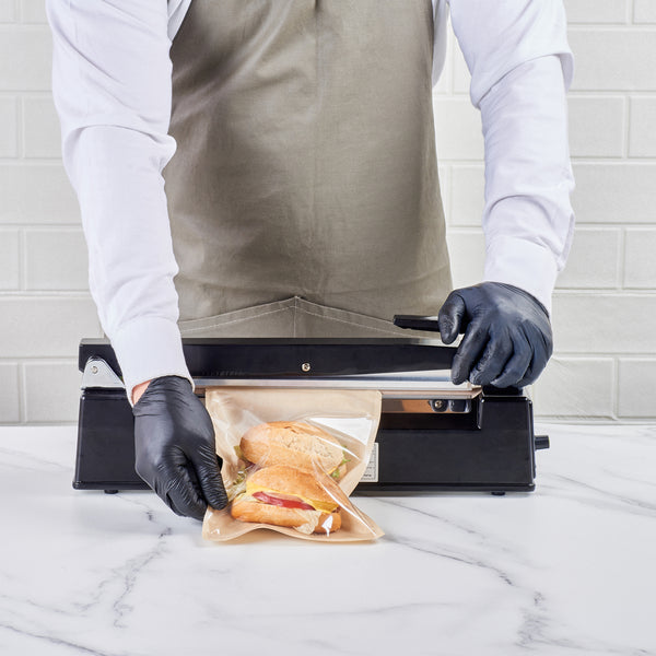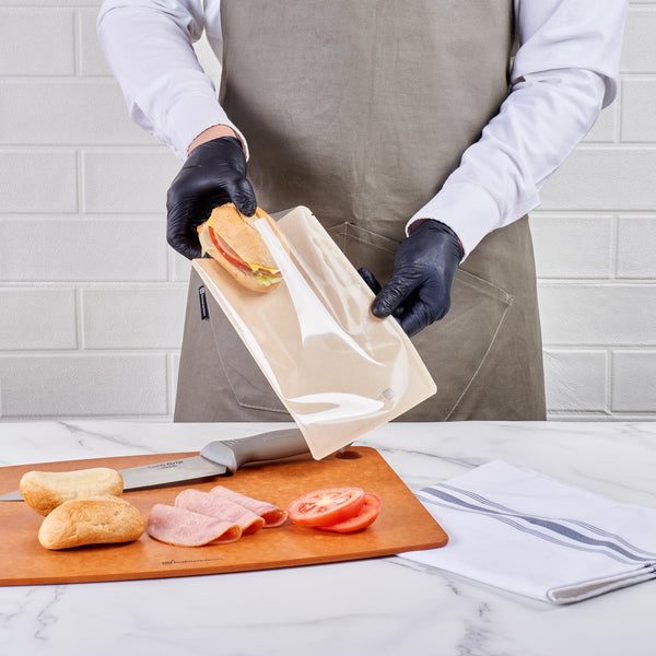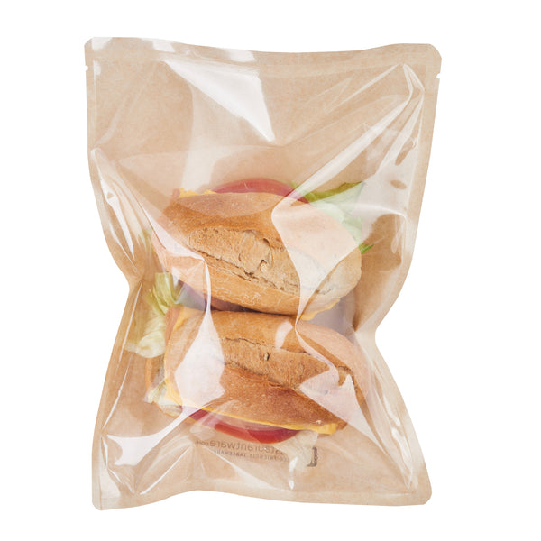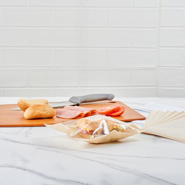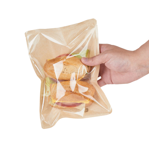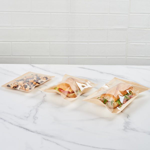Serve more delicious treats with our Bag Tek Kraft Plastic Medium Sandwich and Snack Bags. Ideal for food establishments, these food storage bags are heat sealable to keep food fresh for a long time. Constructed with sturdy and lightweight plastic, these heat-seal bags are a convenient way to store foods while protecting them from humidity. The clear window of these sealable plastic bags allows the customers to easily see the content of the bag without opening it. These plastic snack bags are greaseproof and don't let oils and grease pass through, avoiding a messy eating experience. With a simple kraft finish, these plastic snack bags blend well with all types of decor. Conveniently disposable, these bakery pouches help make cleaning easy. Ideal for packing edible party favors, sandwiches, candies, or dry fruits, each snack bag measures 8.75 inches in length by 6.5 inches in width. Sold in a 100 count box.