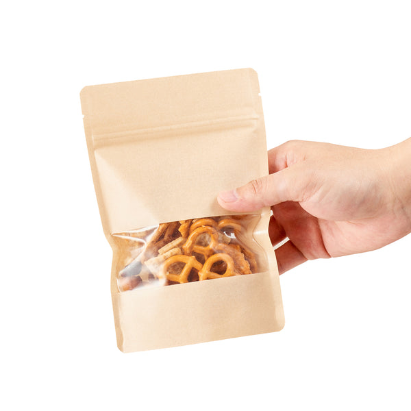 Add style to treat presentations with our Bag Tek Rectangle Kraft Plastic Small Window Bags. These dessert bags are heat sealable to lock in the freshness of foods for longer and help create a tamper-evident packaging solution. With a clear plastic window, these food bags expertly showcase your grab-and-go items to make them the center of attention at your foodservice establishment. These heat sealable bags feature tear notches that allow customers to open bags with ease. Made from high-quality kraft paper, these durable candy bags are conveniently recyclable to meet the eco-friendly standards at your catering service, restaurant, or bakery. Seal these kraft bags with our impulse sealers (SKU: RWT0243 or RWT0244) to preserve the taste of snacks. Measuring 7 inches long by 4.75 inches wide by 1.5 inches tall, these kraft treat bags are sold in a 100 count box. Impulse sealers are available and sold separately.