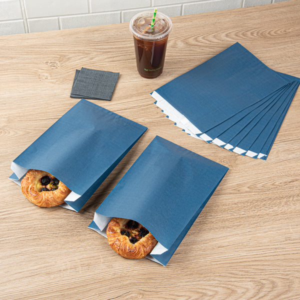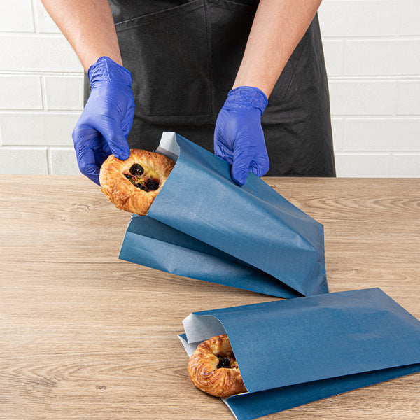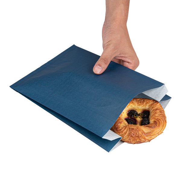Delight your customers with our Bag Tek Midnight Blue French Fry / Snack Bags. Designed with an open pouch, these treat bags are perfect for on-the-go snacks. These snack bags are greaseproof, making them ideal for holding fried snacks such as mozzarella sticks and French fries. The extended upper lip of these paper food bags allows for fast separation, enhancing your service speed. These goodie bags are disposable for a swift cleanup after events or service hours. The striking midnight blue finish of these French fry bags complements the theme or decor of your foodservice establishment. Each sandwich bag measures 7 inches in length by 3 inches in width by 11 inches in height. Shipped in a 100 count box.