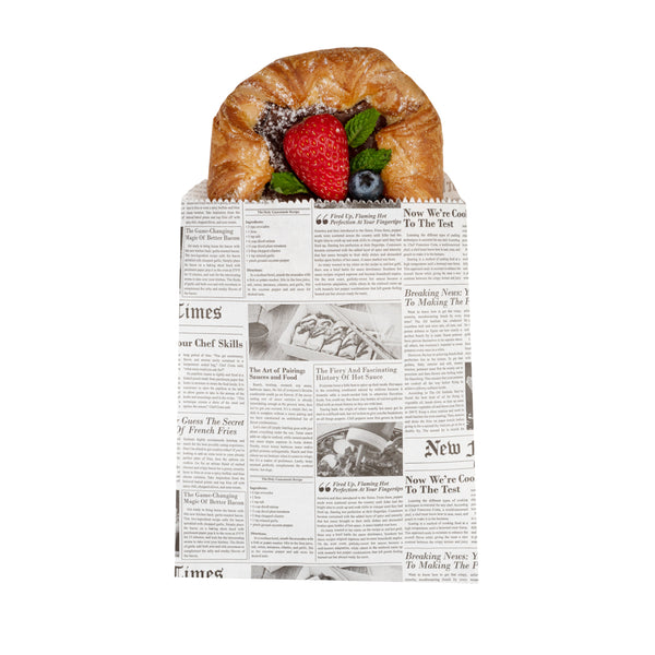 Hand out samples and snacks with our Bag Tek Newsprint Paper Bags. The open-pouch design of these disposable paper bags allows you to make your special treats portable. Crafted from greaseproof paper, these sandwich bags won't create unsightly oily spots to maintain their premium look. With a newsprint finish, these disposable bags give your take out presentations a touch of style. These paper snack bags are biodegradable and recyclable for a sustainable way to dispose of them after use. These newsprint paper bags measure 7 inches long by 5 inches wide. Sold in a 25 count box. This item will only degrade outside of the traditional solid waste stream.