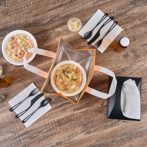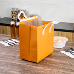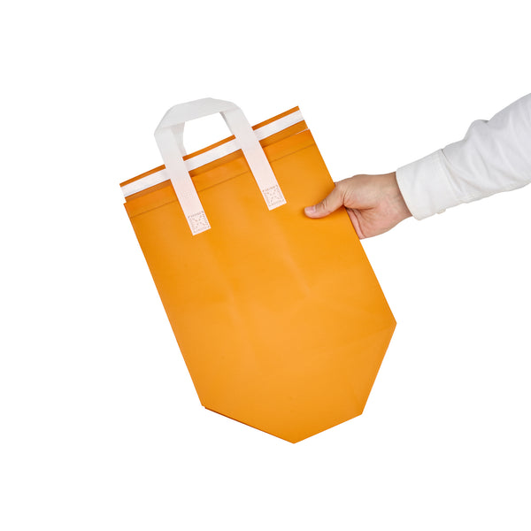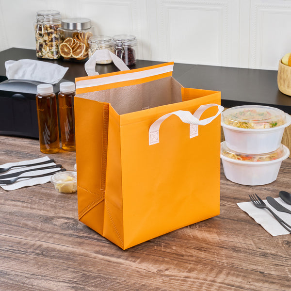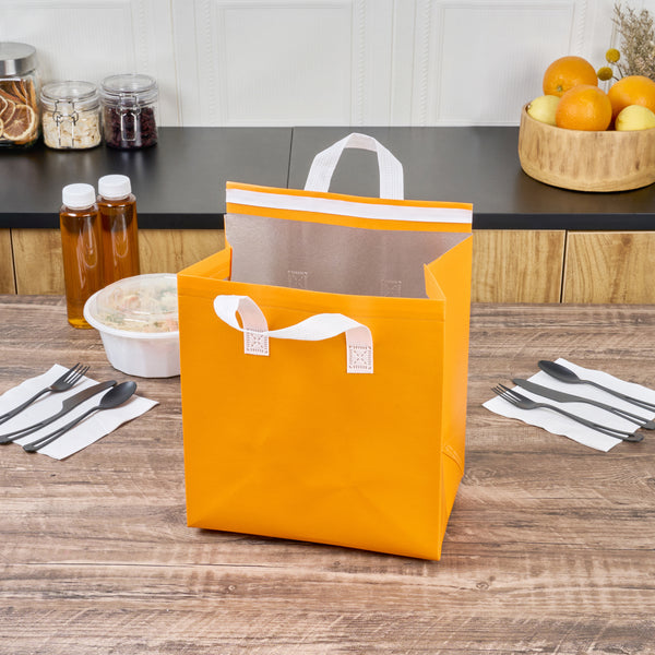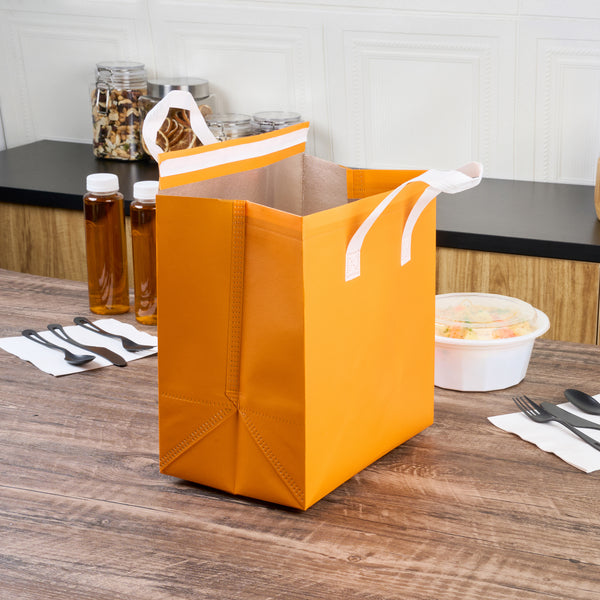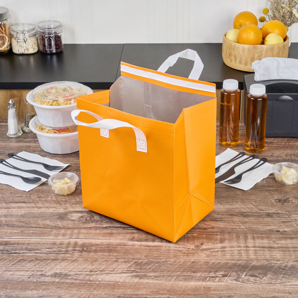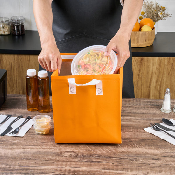 Ensure secure meal deliveries with insulated food delivery bags. Bag Tek Orange Nonwoven Insulated Food Delivery Bags feature advanced insulation technology, maintaining the perfect temperature for both hot and cold foods, making them essential for restaurants and caterers. These thermal grocery bags boast a tamper-evident design, ensuring food safety by alerting staff and customers if the bag has been accessed, which is critical for maintaining trust and hygiene. Their spacious dimensions of 10.25 inches in length, 6.75 inches in width, and 11 inches in height accommodate a variety of food containers, from large entrees to beverages and snacks, offering versatility for different menu items. Crafted from sturdy nonwoven material, these reusable cooler bags are lightweight, foldable, and easy to clean, providing a durable option for repeated use. Sturdy handles ensure easy, stable transport, even with heavy orders. Each order includes 100 Bag Tek Orange Food Delivery Bags.