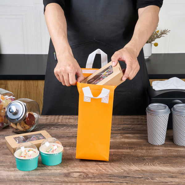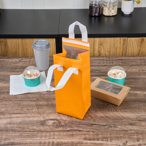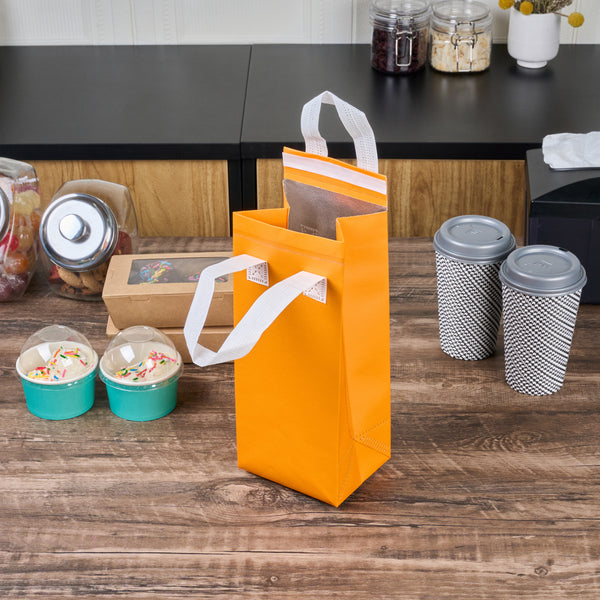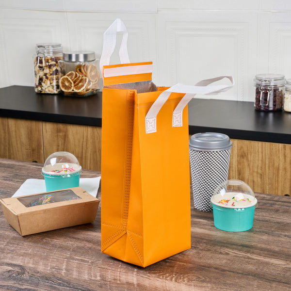 Ensure food safety with Bag Tek Orange Thermal Delivery Bags. These insulated grocery bags feature advanced insulation technology that maintains the temperature of hot or cold items for hours, ensuring optimal food quality upon delivery. Their spacious design seamlessly accommodates large food orders, making them ideal for quick-service restaurants and catering services. Constructed from nonwoven material, these reusable insulated bags are lightweight and foldable, saving valuable storage space while providing easy cleaning for repeated use. Sturdy handles ensure stable transport, enhancing the reliability of your delivery service and adding a professional touch to your operations. With a vibrant orange color, these thermal delivery bags increase brand visibility and make a lasting impression on customers. Elevate your food delivery experience with these innovative bags that measure 4.75 inches by 4 inches by 11 inches. Each order includes 25 Bag Tek Orange Thermal Delivery Bags.