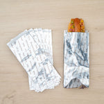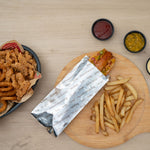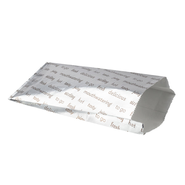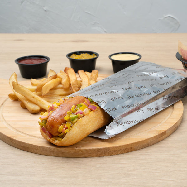 Keep hot dogs warm for customers using our Bag Tek Paper Printed Small Hot Dog Foil Bags. These foil hot dog bags are perfectly sized to fit small hot dogs, subs, or other ready-to-eat dishes. Featuring a non-vented design, these small foil bags retain heat and moisture to keep hot dogs at the perfect temperature. Crafted with durable aluminum foil and paper, these small foil bags are freezer-safe and heat-resistant to conveniently package hot and cold foods at your foodservice establishment. Featuring a stylish printed design, these foil hot dog wrappers elevate the look of your to-go hot dogs. The greaseproof interior of these foil hot dog bags prevents greasy and oily foods from leaking through and creating messes. These small foil bags measure 3.7 inches in length by 1.2 inches in width and 9 inches in height. Shipped in a 100 count box.