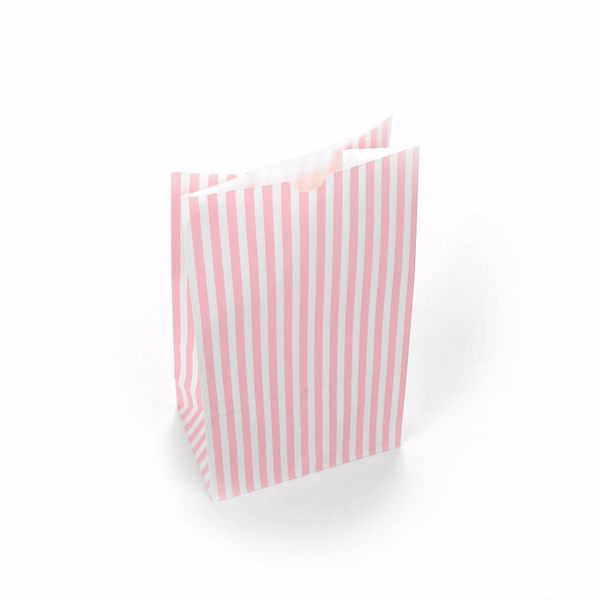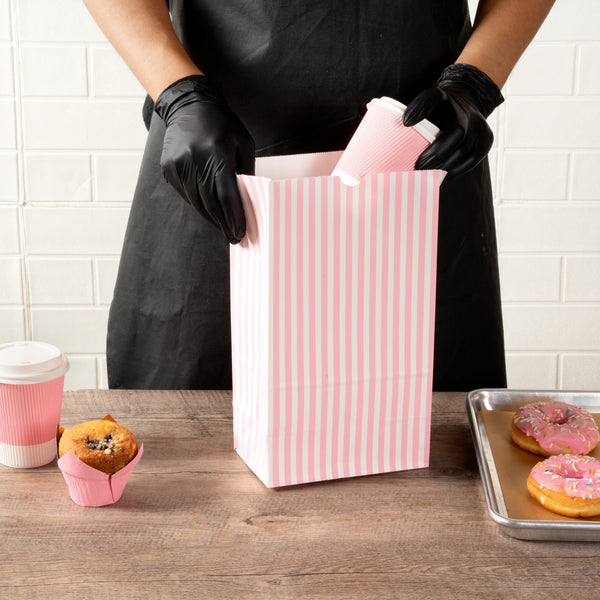 Impress customers with our Bag Tek Pink and White Stripe Paper Bags. These take out bags can hold up to 12 pounds, ideal for family-sized orders and grocery items. Made from high-quality paper, these popcorn bags are durable and have a grease-resistant coating to prevent oil or sauce from seeping through. The elegant pink and white stripes of these disposable lunch bags complement your existing takeout supplies. These paper deli bags have an open-top design for easy access and a fold-down feature to secure meals and make meal transportation clean and simple. To easily store your leftovers, these disposable merchandise bags are freezer-safe. For quick cleanup, these pink and white bags are disposable. The flat bottom design of these merchandise bags allows for a stable and convenient packing experience. Each paper grocery bag has a capacity of 12 pounds and measures 7 inches in length by 4.25 inches in width by 12.5 inches in height. Shipped in a 100 count box.