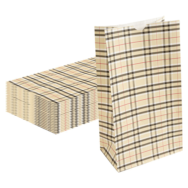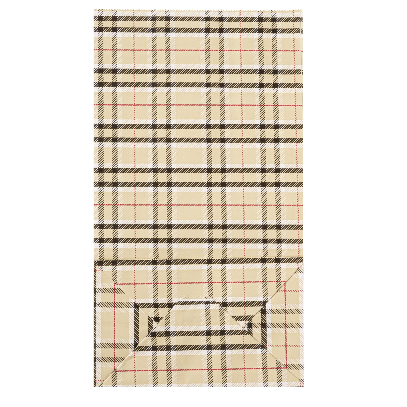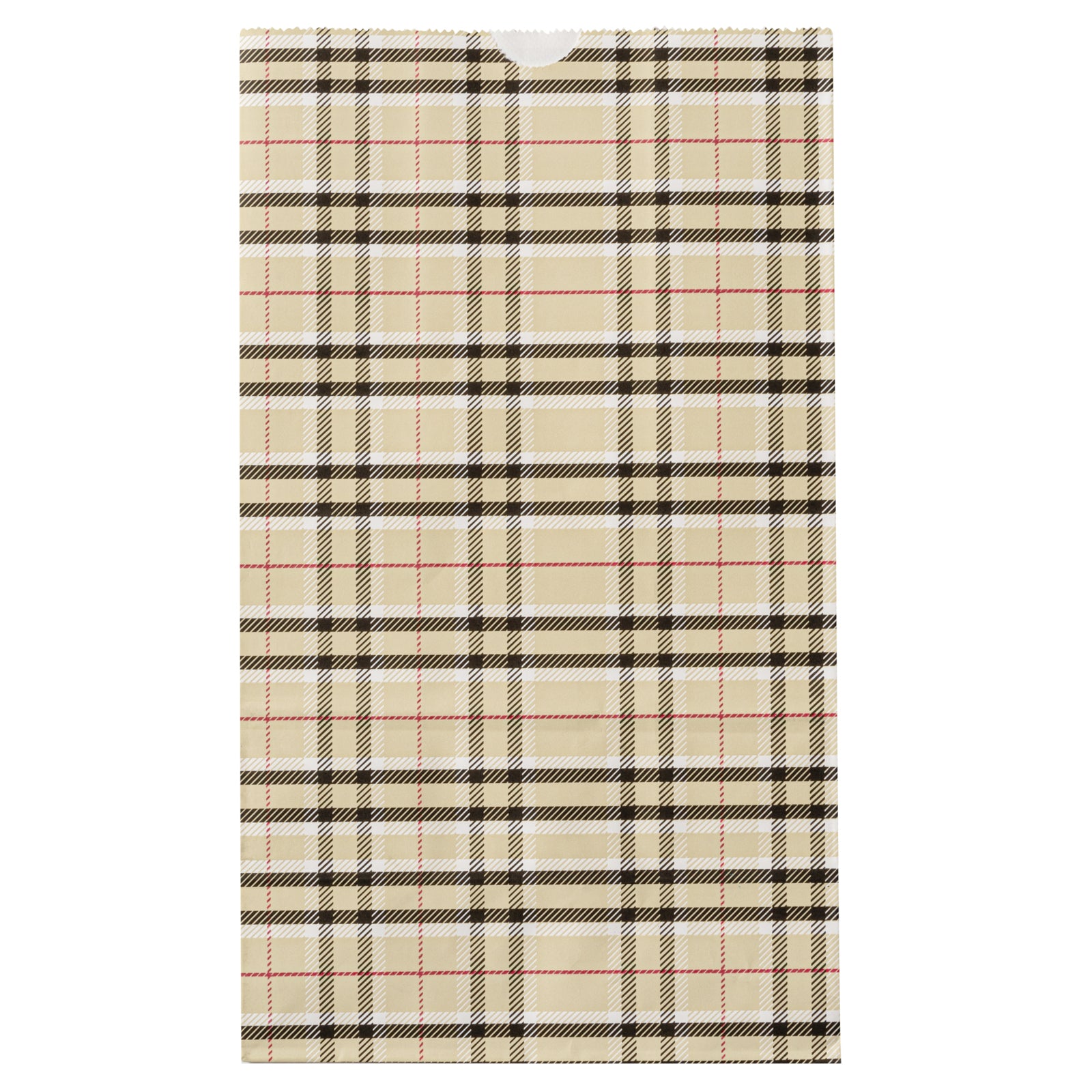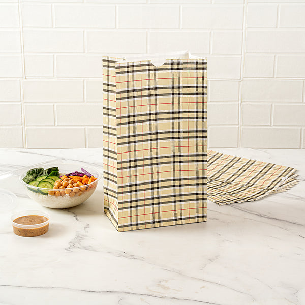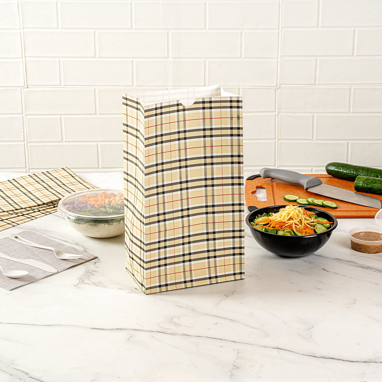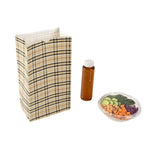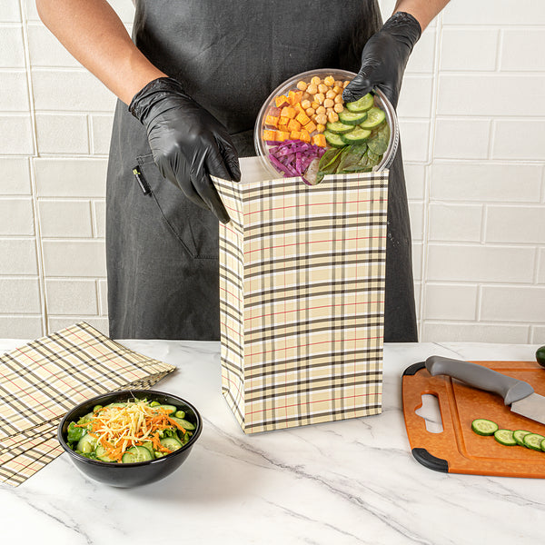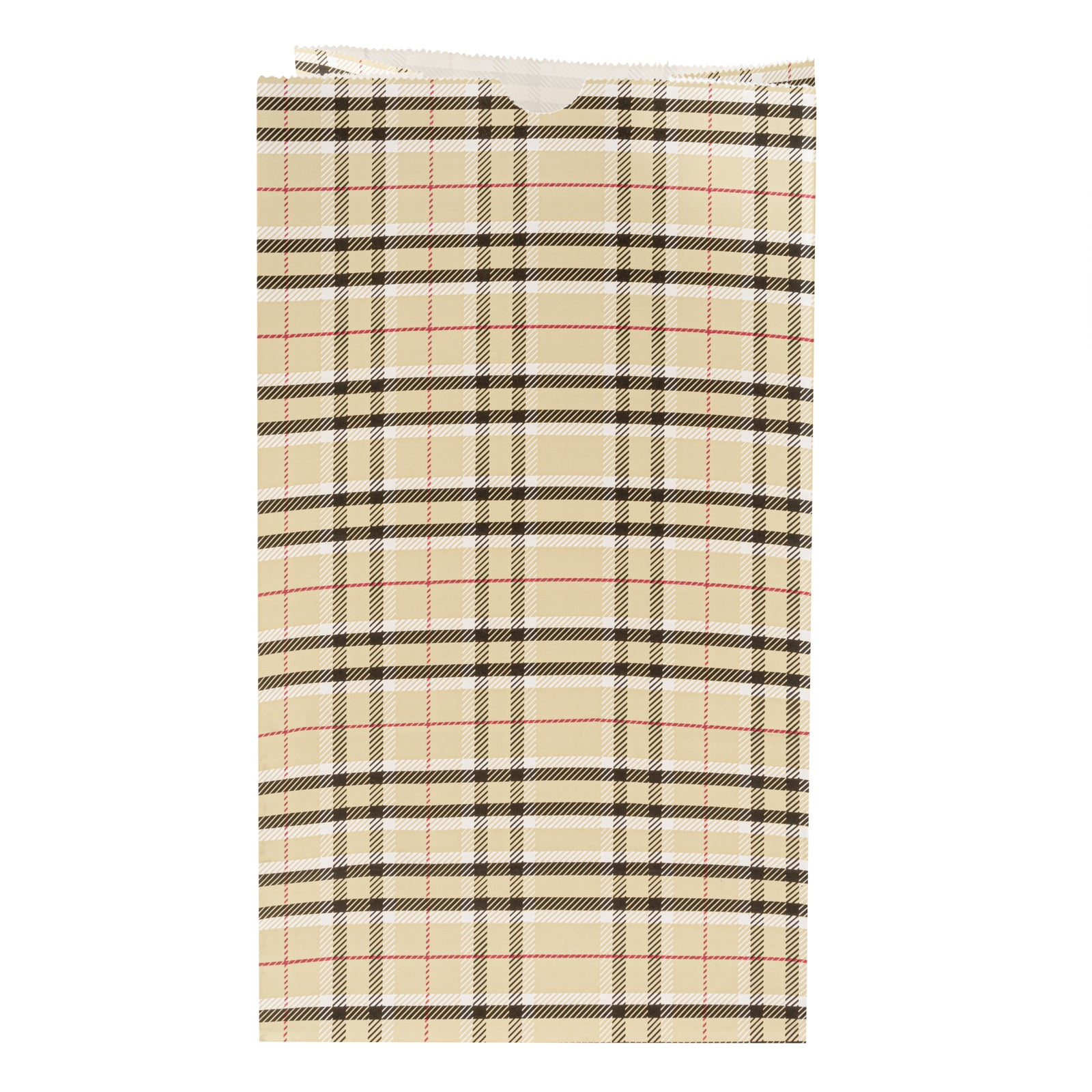 Utilize our Bag Tek Plaid Paper Bags for a trendy way to transport larger orders. Capable of holding 12 pounds, these merchandise bags are suitable for large meals and grocery items. Made from high-quality, paper, these disposable lunch bags are durable with a grease-resistant coating to prevent oil or grease seepage. The eye-catching plaid print of these take out bags complements the rest of your take out supplies. To easily store your leftovers, these disposable paper bags are freezer-safe. Featuring an open-top design and fold-down capabilities, these paper deli bags ensure mess-free transport. These disposable grocery bags facilitate a quick and easy cleanup. The flat bottom construction of these popcorn bags facilitates stability and easy packing. Each paper grocery bag has a capacity of 12 pounds and measures 7 inches in length by 4.25 inches in width by 12.5 inches in height. Shipped in a 100 count box.