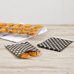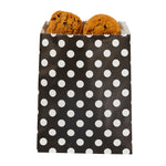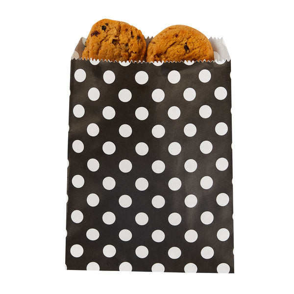 Give your bakery packaging supplies a much-needed upgrade with our Bag Tek Rectangle Black Paper Bags with White Polka Dots. Measuring 7 inches long by 5 inches wide, you can use these paper pastry bags to house all types of confectionery creations. Stuff them full of pastel-colored macarons and orange-glazed sugar cookies -- or use them to package toasted coconut brownies and powdered sugar dusted bear claws. These trendy paper bags give customers a mess-free way to enjoy your delectable pastries -- and they give you a convenient way to serve them! Not to mention, these nature-friendly paper bags are recyclable and biodegradable. For easily personalized cookie bags, simply roll or fold down the bags and secure them with a customized sticker. These black and white polka dotted bags are sold in bulk 100 count boxes. This item will only degrade outside of the traditional solid waste stream.