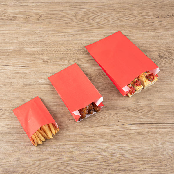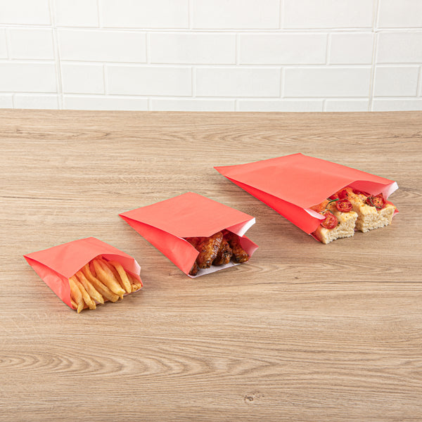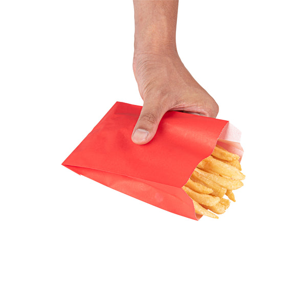 Upgrade your snack service with our Bag Tek Red Paper French Fry / Snack Bags. These high-quality paper food bags are greaseproof, ensuring that oils and greases don't cause messy situations. The open-pouch design of these treat bags allows patrons to comfortably enjoy finger foods without hassle. Featuring an extended lip, these French fry bags are easy to open for snack packaging. The bright red color of these snack bags enhances the overall presentation of your take out supplies. These red snack bags are disposable for swift post-meal cleanup. Each red paper bag measures 4.25 inches in length by 1.5 inches in width by 6.25 inches in height. Sold in a 100 count box.
