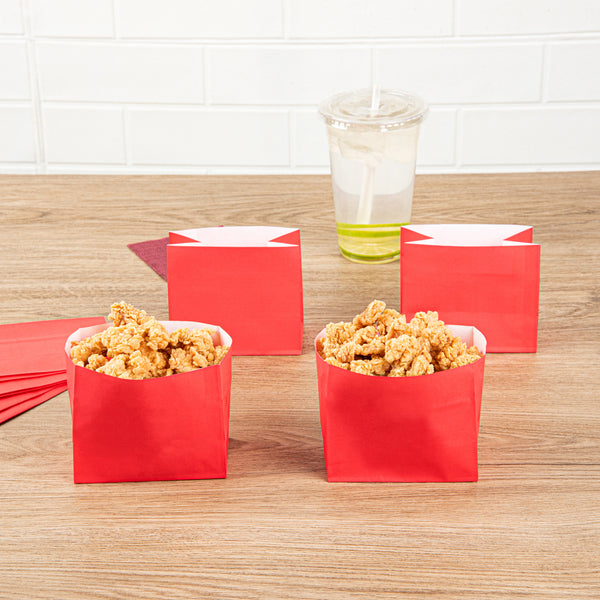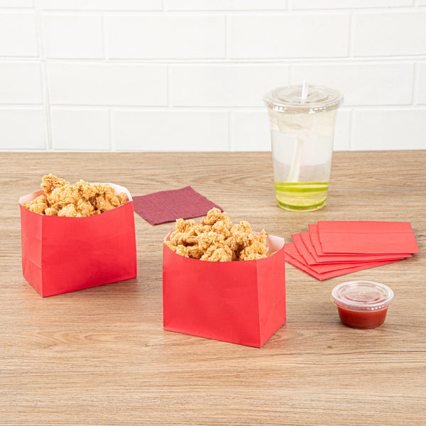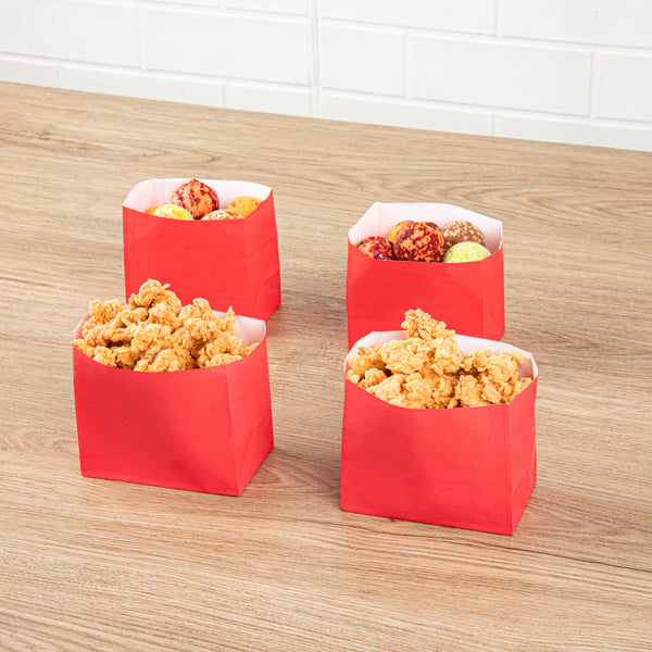 Enhance your snack presentation with upright packaging solutions. Bag Tek Red Paper Snack Bags feature a flat bottom design, ensuring they stand upright for an attractive display of your snacks. The high-quality paper construction supports hefty food items without tearing, ensuring durability and reliability during transport. Their recyclable nature supports eco-friendly disposal practices, appealing to environmentally conscious businesses. Elevate your foodservice operations with these versatile paper snack bags. Each order includes 100 Bag Tek Red Paper Snack Bags – Flat Bottom – 4.25" x 2.5" x 3.75".