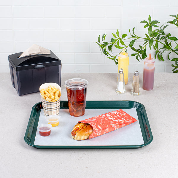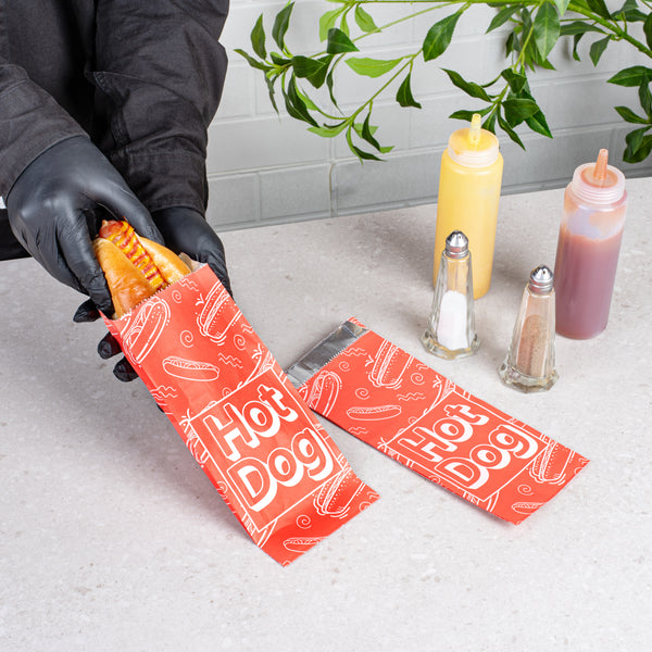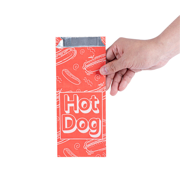 Elevate your food service with our Bag Tek Red Paper Printed Small Hot Dog Foil Bags. These food packing bags feature an aluminum foil-lined interior for excellent heat retention, keeping your meals hot and delicious. To prevent oil or sauces from seeping, these foil bags are greaseproof for a mess-free eating experience. These take out bags have a non-vented design and provide moisture retention to keep your meals juicy and delicious. Featuring a unique hot dog print on a red finish, these hot dog bags visually elevates the appeal of your of to go orders. With a printed message that reads “Hot Dog”, these foil pouches add a touch of fun and enhance your food presentation. The exterior of these hot food bags is crafted from premium paper, making them durable and suitable for securely packing your tasty creations. These hot dog wrappers are freezer-safe and let you refrigerate your food items. Ideal for efficient cleanup, these disposable food bags can be discarded after use. These foil lined bags measure 3.74 inches in length by 1.18 inches in width by 9.06 inches in height and offer ample space for various foods. Sold in a 100 count box.