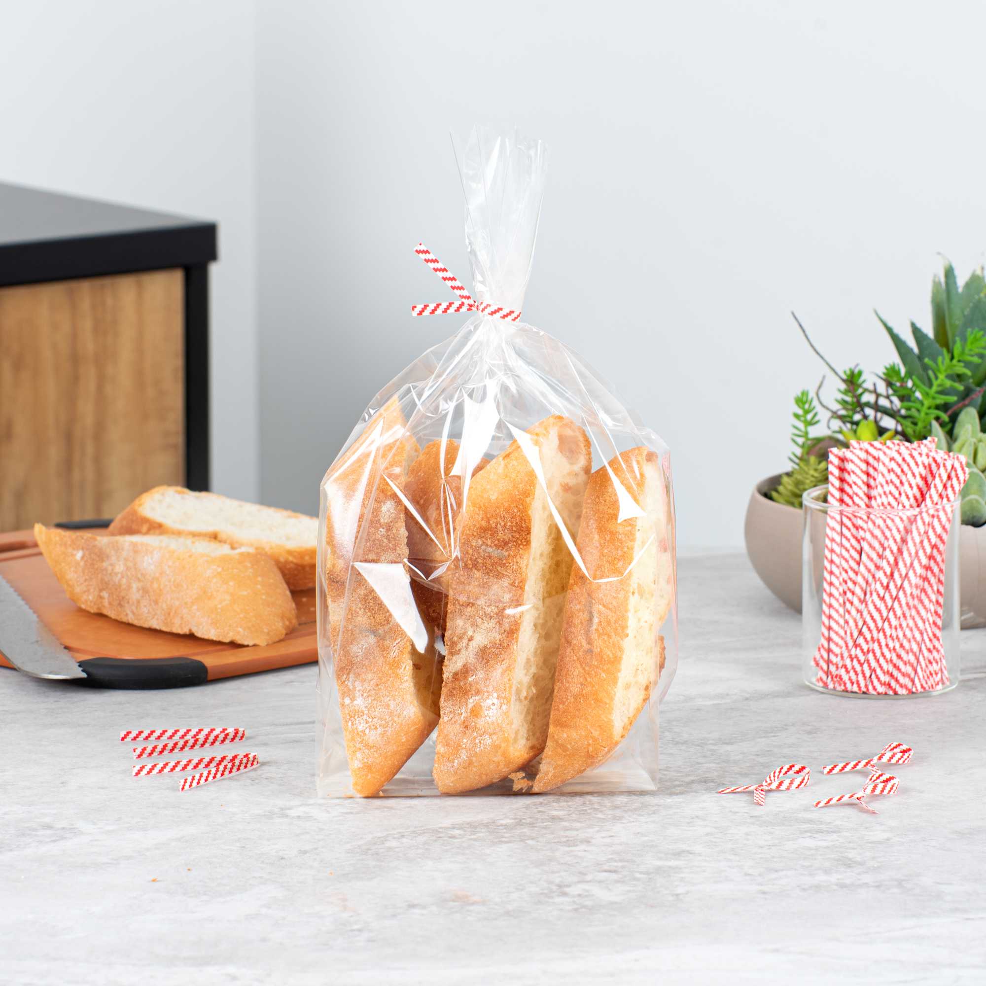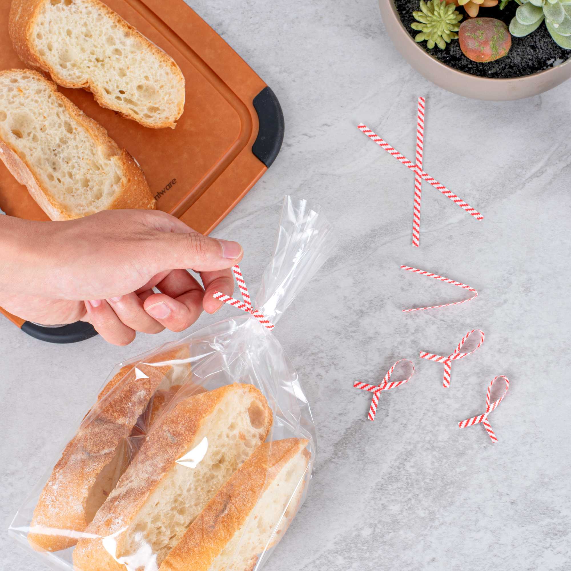 Ensure efficient food packaging with our Bag Tek Red Stripe Paper Twist Ties / Bag Ties. The twist ties are designed with a strong grip to keep your bakery and gift bags securely sealed. The distinctive red stripe and flush-cut ends aid quick identification in bustling kitchen environments, allowing for seamless and accurate bag sealing. Enhance your packaging process with these reliable laminated ties. Measuring 4 inches in length, these paper twist ties provide a reliable closure for sliced loaves and pastries, enhancing freshness and presentation in foodservice operations. Sold in a 500 count box.