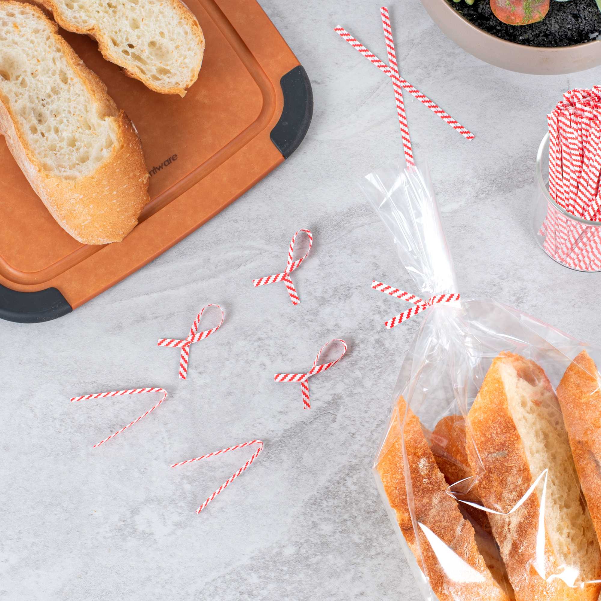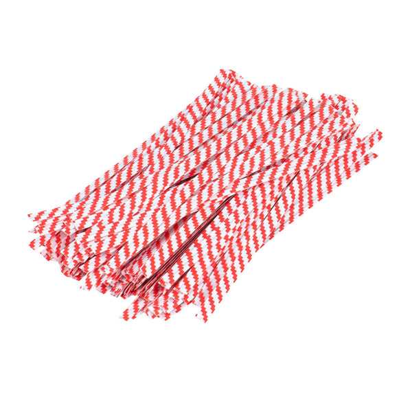 Ensure efficient food packaging with our Bag Tek Red Stripe Paper Twist Ties / Bag Ties. The twist ties are designed with a strong grip to keep your bakery and gift bags securely sealed. The distinctive red stripe and flush-cut ends aid quick identification in bustling kitchen environments, allowing for seamless and accurate bag sealing. Enhance your packaging process with these reliable laminated ties. Measuring 4 inches in length, these paper twist ties provide a reliable closure for sliced loaves and pastries, enhancing freshness and presentation in foodservice operations. Sold in a 5,000 count box.