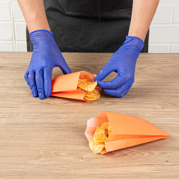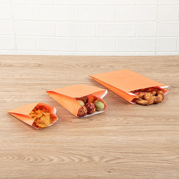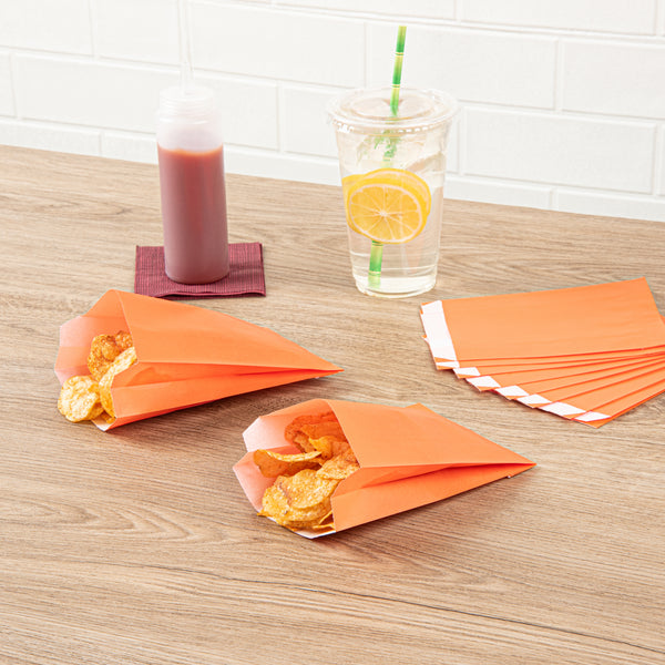 Brighten up your snack presentation with our Bag Tek Tangerine Orange Paper French Fry / Snack Bags. Crafted from high-quality paper, these treat bags are greaseproof, keeping oil and grease-related messes at bay. The open-pouch design of these snack bags allows patrons to easily access and relish their tasty treats. These French fry bags have an extended lip that facilitates your staff to quickly pack snacks for smooth service. These orange paper bags are disposable for a seamless cleaning experience. The vivid orange finish of these goodie bags complements your take out supplies wonderfully. Each orange snack bag measures 4.25 inches in length by 1.5 inches in width by 6.25 inches in height. Sold in a 100 count box.